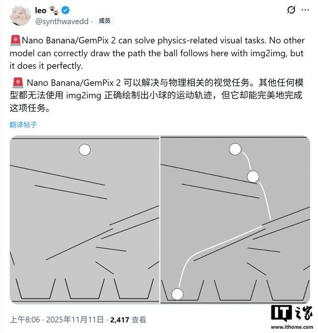 According to leaked information, Nano Banana 2 introduces two major improvements. First, it can handle visual tasks that involve physical logic. For instance, in a leaked image, the model employed “img2img” technology to accurately trace the physical trajectory of a moving ball—a feat that currently surpasses the capabilities of other AI models. This marks a substantial leap in AI understanding of real-world physics within images.