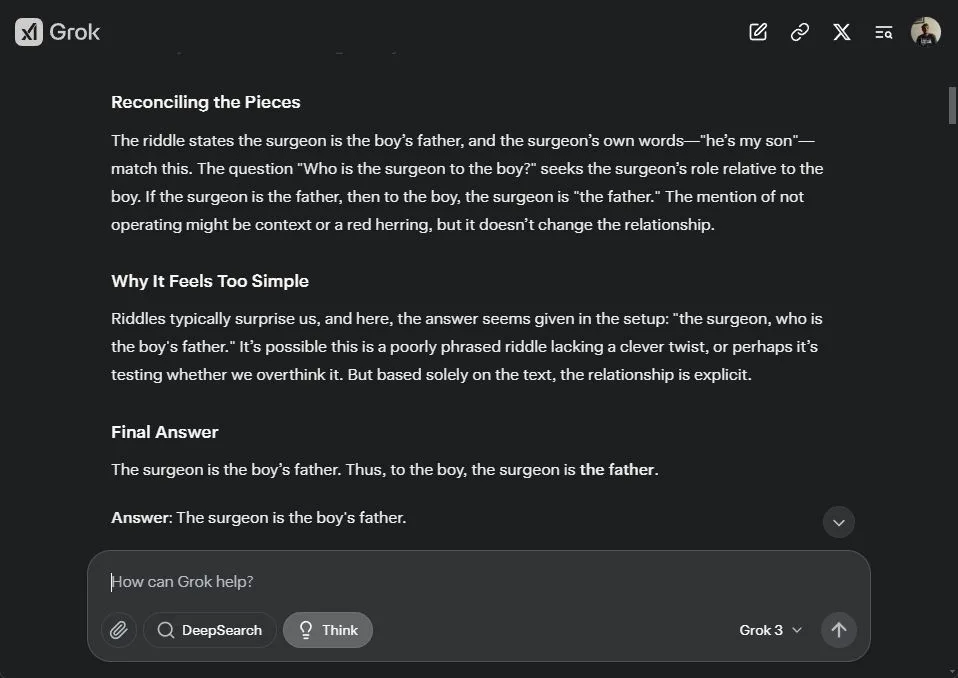 Following that, I presented a trickier riddle intended to mislead it. In my previous tests with ChatGPT o1 and DeepSeek R1, both incorrectly concluded that the surgeon was the boy’s mother. Even the latest OpenAI o3-mini-high made the same mistake, neglecting the clear detail in the prompt that stated the surgeon was the boy’s father.