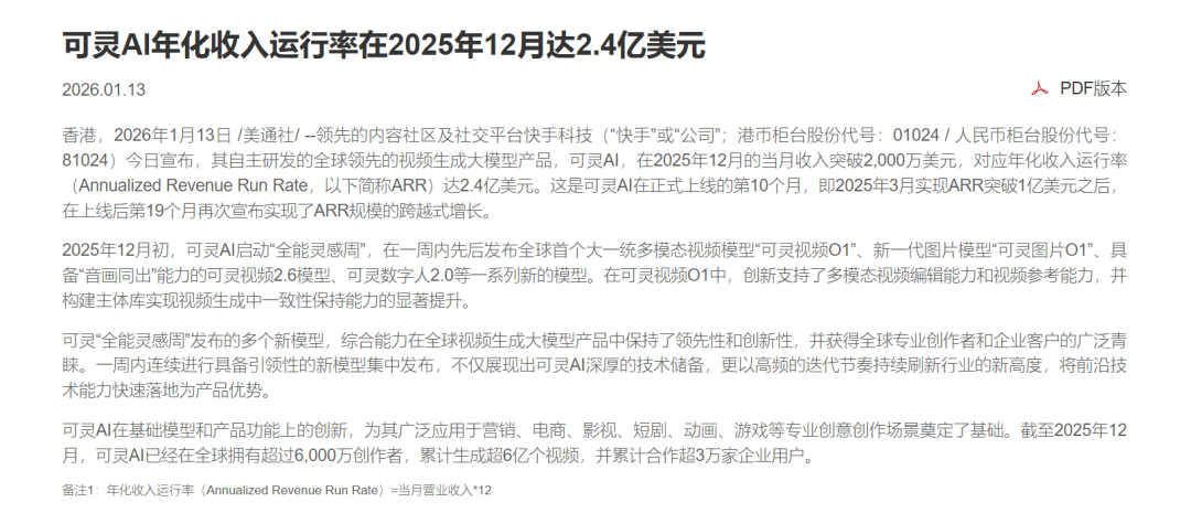 On January 4th, Kuaishou Technology announced significant growth for its AI platform, called KeLing AI. The company revealed that by December 2025, KeLing AI’s monthly revenue exceeded $20 million, translating to an annualized revenue run rate (ARR) of approximately $240 million.