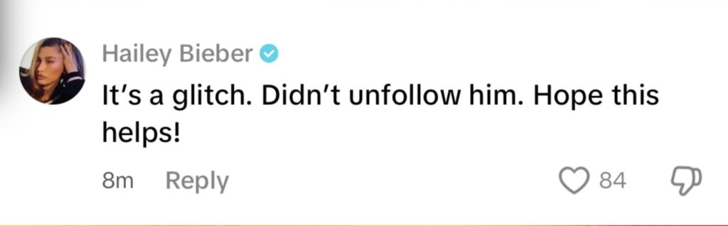 Hailey swiftly addressed the rumors, stating that the situation was merely a technical error. In a response to a TikTok video, she wrote, “It’s a glitch. Didn’t unfollow him. Hope this helps!”