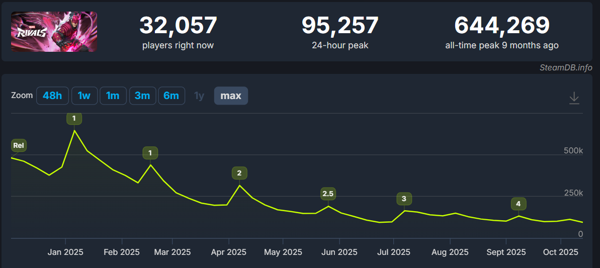 Referring to the chart above, Marvel Rivals has seen a steep drop in Steam activity since its December 2024 launch. However, it’s important to note that the game was also released on other platforms like PlayStation 5 and Xbox Series X|S, making it unfair to judge its overall performance based solely on Steam metrics.