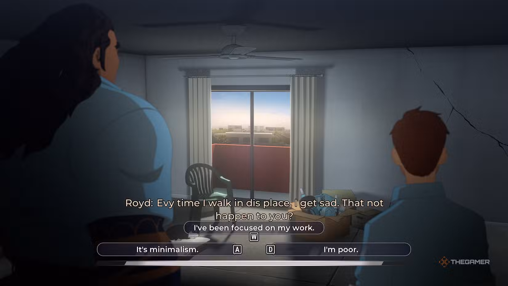 In the beginning, you’ll chat with Royd while moving the wrecked Mecha Man suit from Robert’s apartment to Royd’s lab. Feel free to ask questions to learn more about Royd and the suit. Once that’s done, you’ll head to the office.