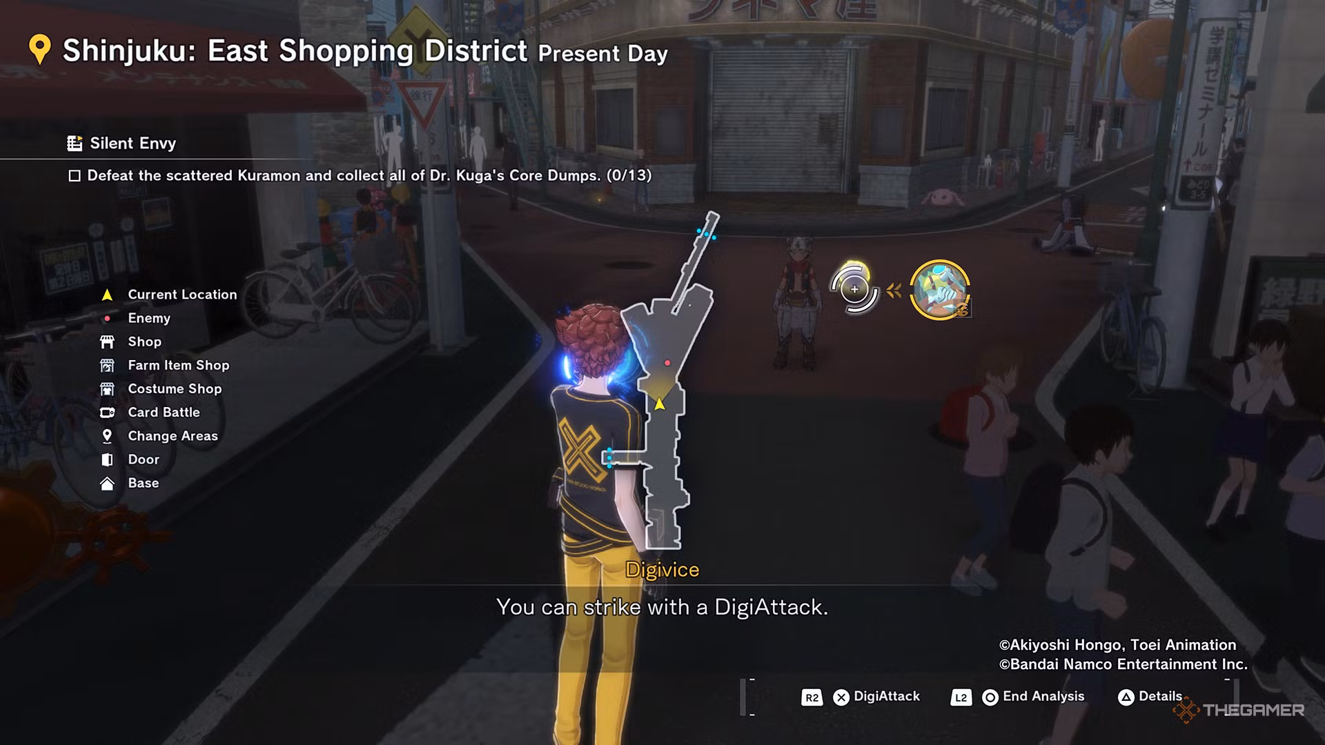Silent Envy doesn’t appear in your mission log immediately. Instead, Dr. Simmons will contact you after your first trip back to Shinjuku following your reunion with Aegiomon and just before the final battle. She will ask you to find 13 Kuramon scattered across Shinjuku and defeat each one. Almost every area in the Human World has a Kuramon, marked by a red dot on your map. Use a DigiAttack to defeat the Kuramon and collect the Core Dump.