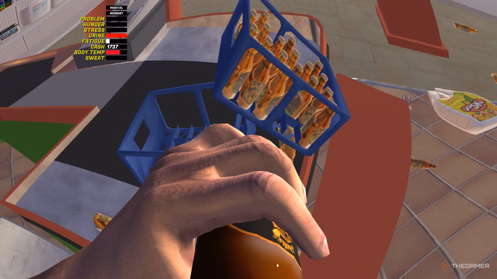 Luckily, there are attribute bars on the top left of your screen that show how you’re feeling and how close you are to danger. If any attribute stays in the red zone for too long, your character could die, and you’ll lose progress. There are seven main attributes to keep an eye on, along with cash, which isn’t a life-or-death factor but still important: