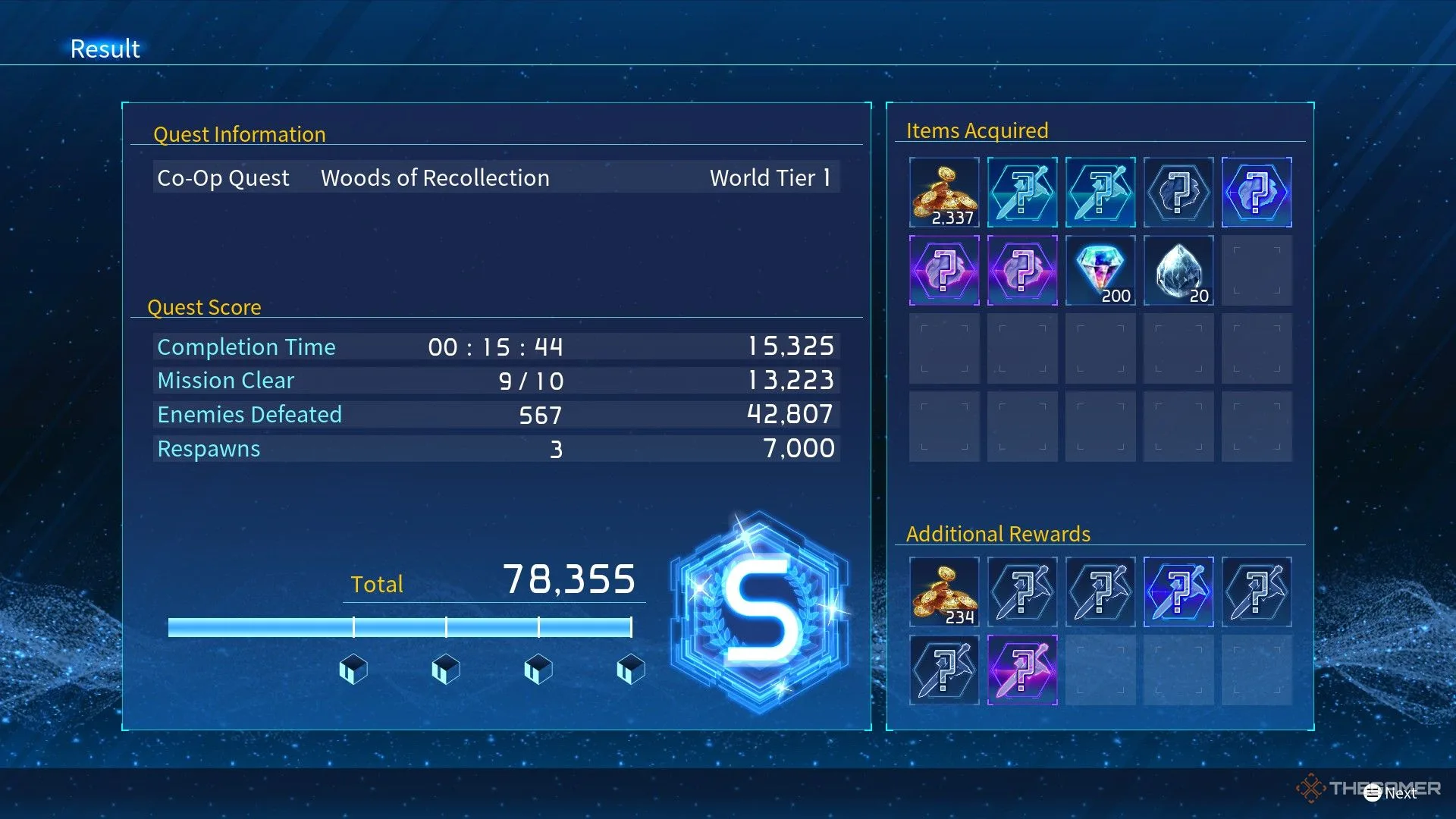 Additionally, completing a quest without dying gives you an extra 10,000 points. To avoid death, make good use of your Healing Crystals, grab Healing Spheres from chests, and, if possible, include a support character in your team who can heal you. Be sure to explore the entire map and defeat all enemy groups.