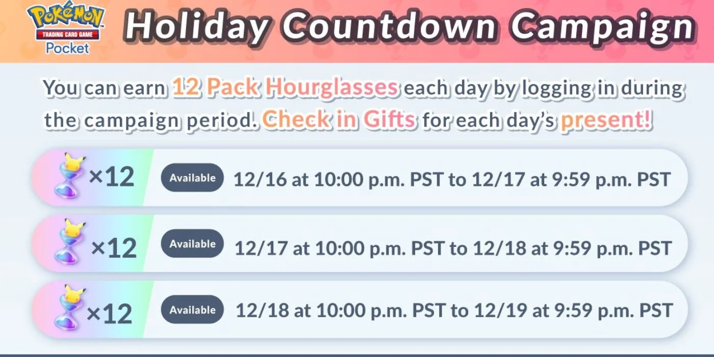Holiday Countdown Campaign Schedule for Pokémon TCG Pocket
