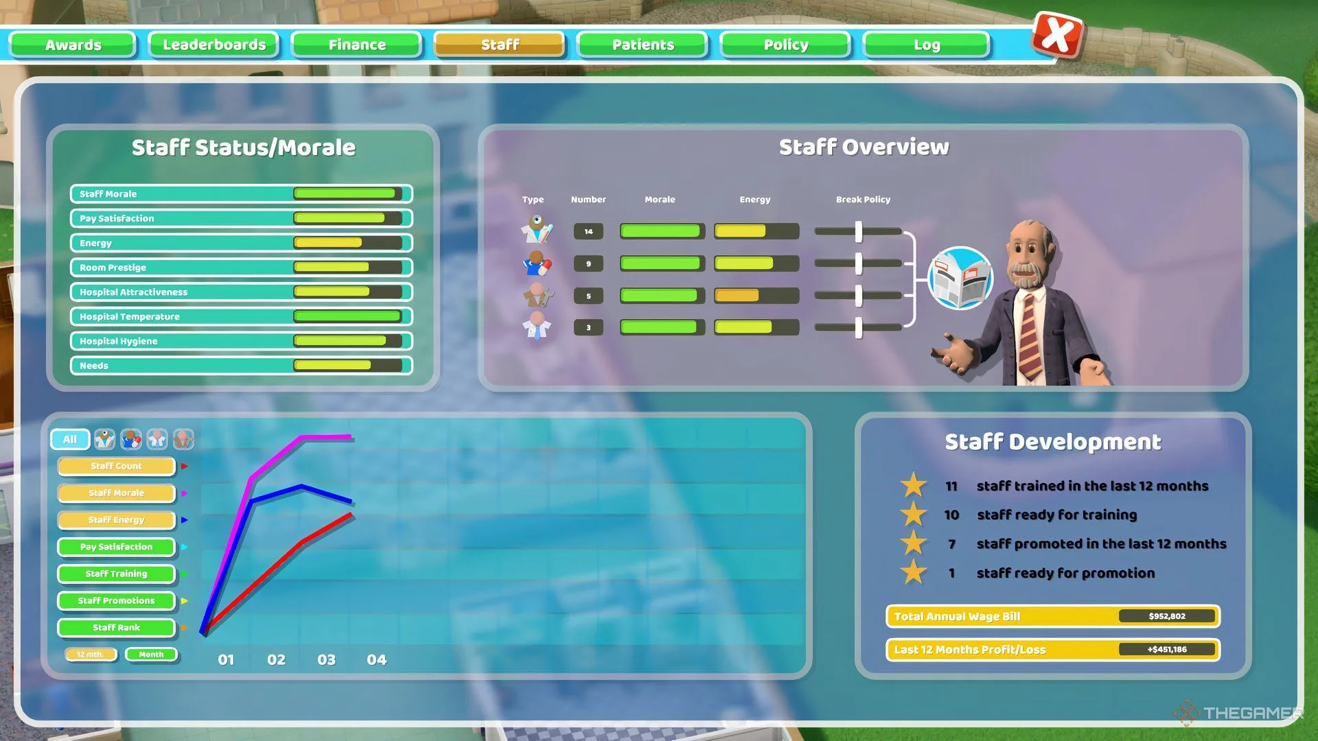 In Two Point Hospital, one of your key responsibilities as a manager is to keep your staff content in their roles. Monitoring their Morale levels is essential because nobody wants to be treated by a cranky doctor when they’re already feeling under the weather (perhaps they’re seeing stars!).