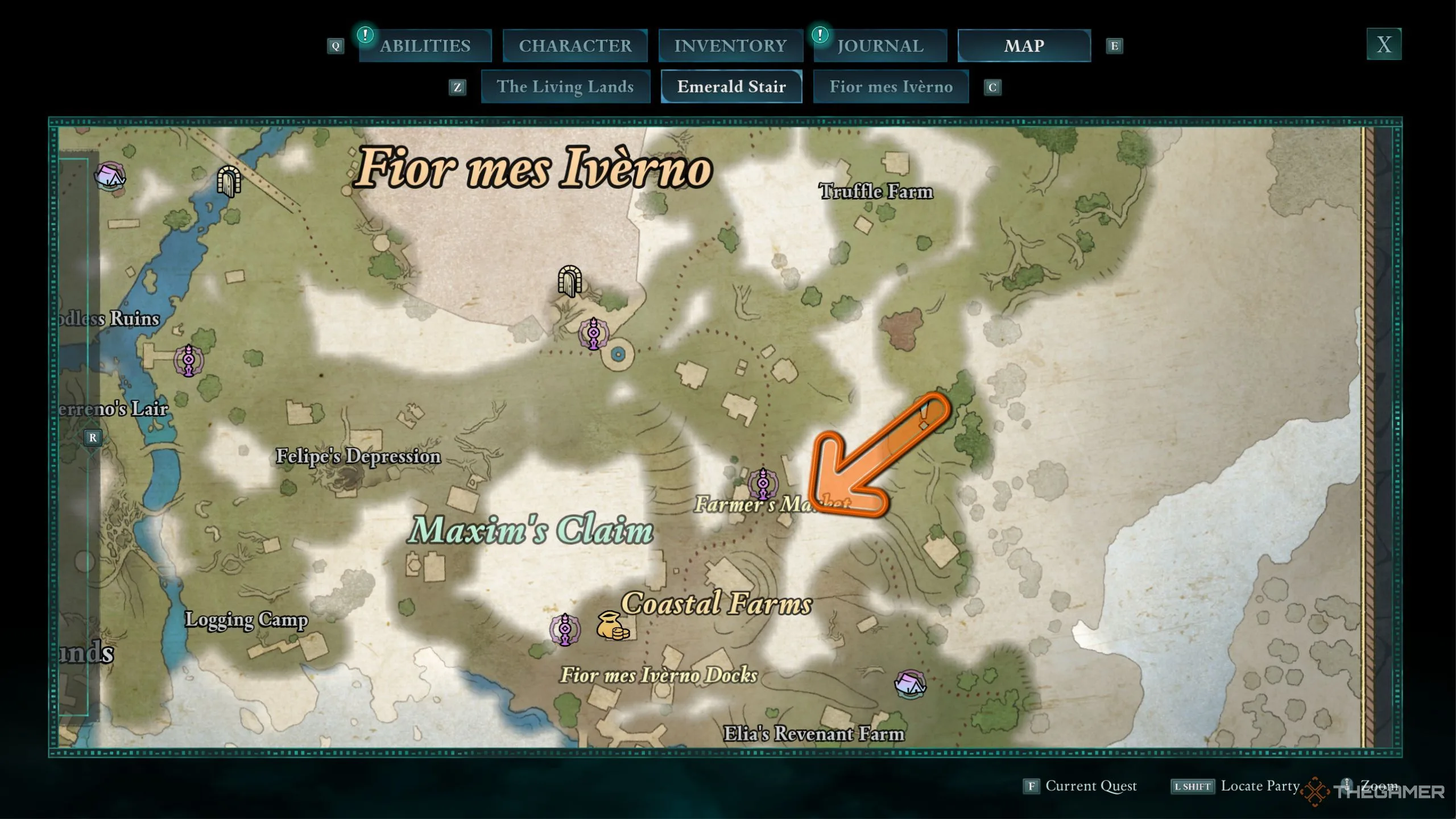 To retrieve the clues for the Emerald Stairs totem, head to the Farmer’s Market, located southeast of Fior Mes Iverno. You’ll encounter this area during the Elder Offerings quest as well. If you’ve completed the main storyline for the Emerald Stairs, you might instead find the trader at Coastal Farms.