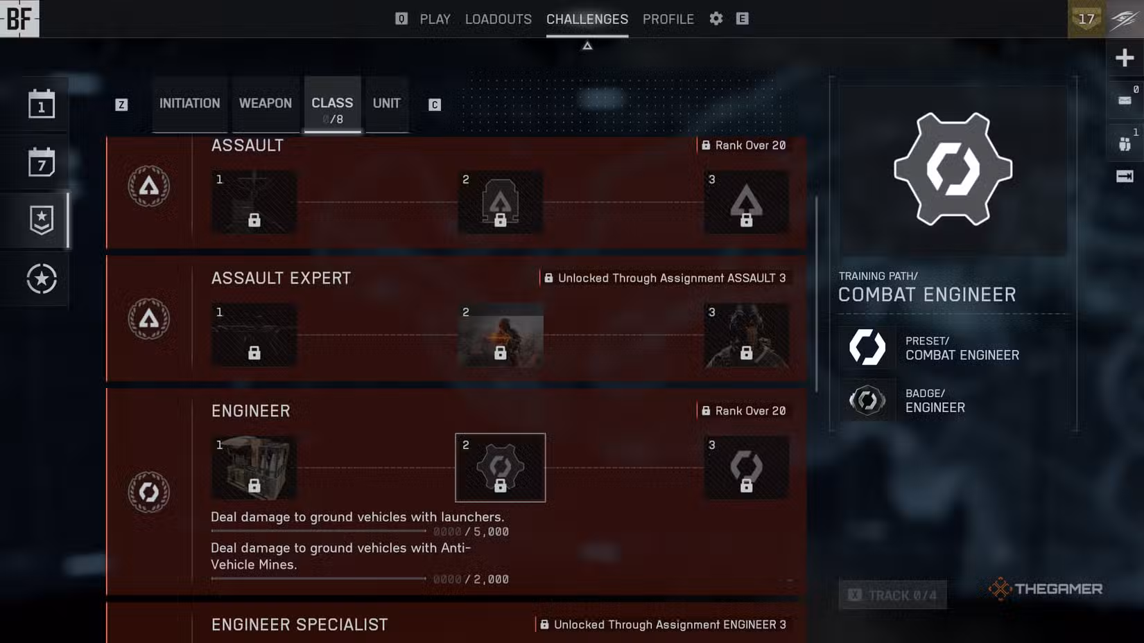 | Combat Engineer (Engineer) | Repair vehicles for 2,000 health, score 10,000 points, inflict 5,000 damage on ground vehicles with launchers, or deal 2,000 damage with mines. |