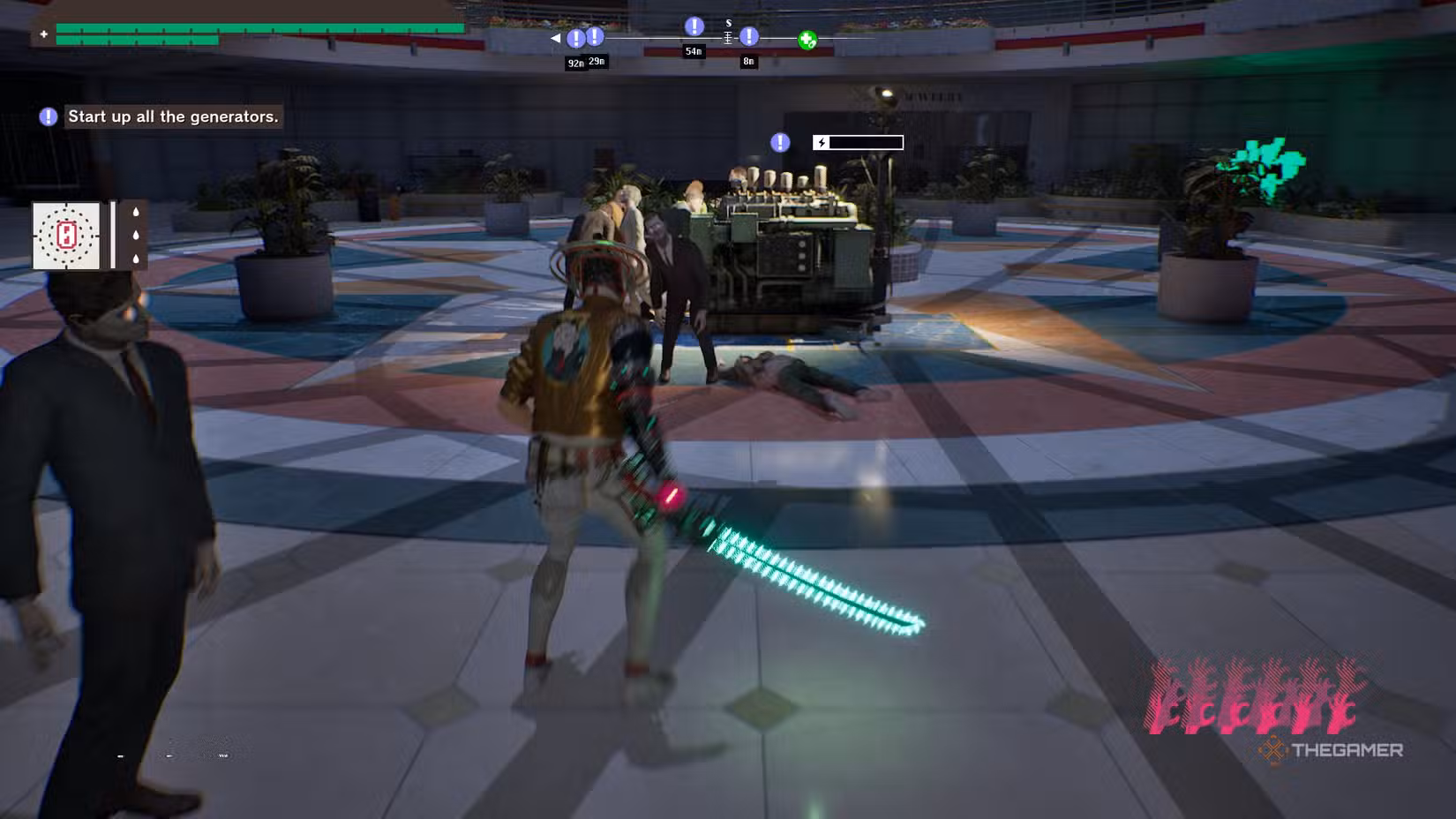 After the opening scene, Romeo is a Dead Man begins with you in a run-down shopping mall. Your main first task is to restore power to four generators spread throughout the abandoned store. Kimberly will guide you toward the singularity gate, which is your ultimate goal.