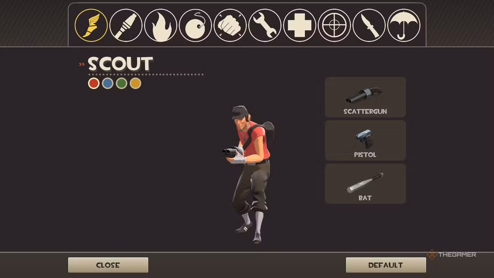The Scout is an offensive player, excelling at short to medium range. His main weapon is the Scattergun, a shotgun, but he can switch to a Nailgun for better precision. His secondary options include a Pistol or a Brick, and he wields a Bat melee weapon. The Scout stands out as the only character able to double jump and has a bonus that lets him capture points faster.
