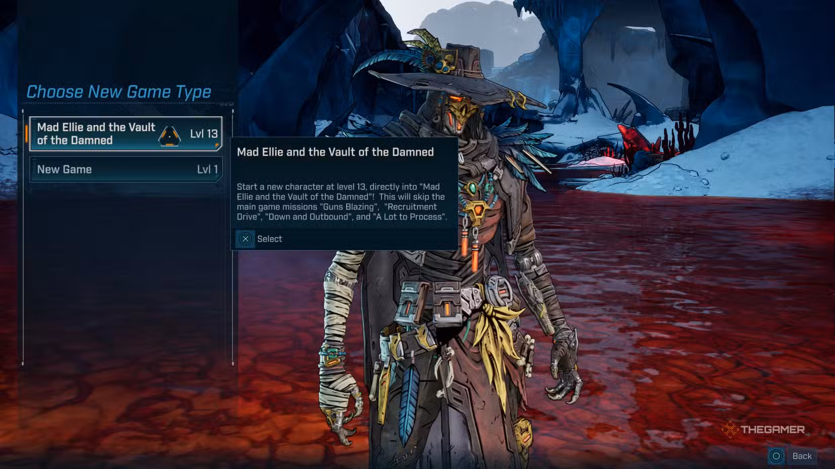 Mad Ellie and the Vault of the Damned DLC offers two ways to access its story and content. First, you can start a new game after purchasing the DLC by selecting the Mad Ellie and the Vault of the Damned game type from the main menu. This begins the game with a level 13 Vault Hunter, equipped with basic gear, movement skills, a vehicle, and all initial story missions completed—such as Guns Blazing, Recruitment Drive, Down and Outbound, and A Lot To Process. This method lets you jump straight into the DLC with a fresh Vault Hunter, like C4SH the Rogue, without needing to redo the intro missions.