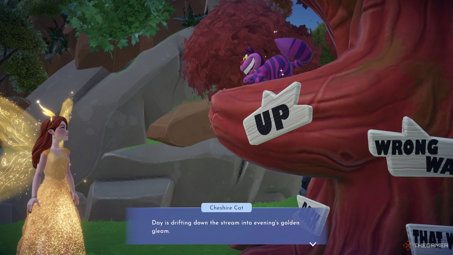 Finally, return to the Cheshire Cat to finish the quest and gain additional friendship points. It seems the Cheshire Cat just wanted to stir up a little chaos out of homesickness!