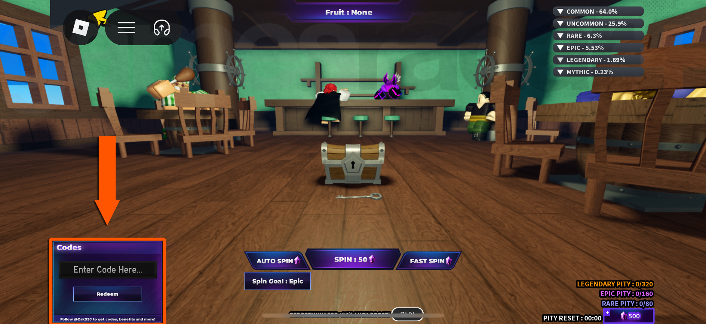 To use a code, select the Spin Fruit option from the main menu. This opens a bar area with a chest labeled SPIN—tap it to go to the spinner, where you can win new fruits. In the bottom left corner, there’s a box to enter your code. Type it in exactly as shown, including punctuation, then click Redeem. Make sure the codes are case-sensitive; entering them wrong will cause an error.
