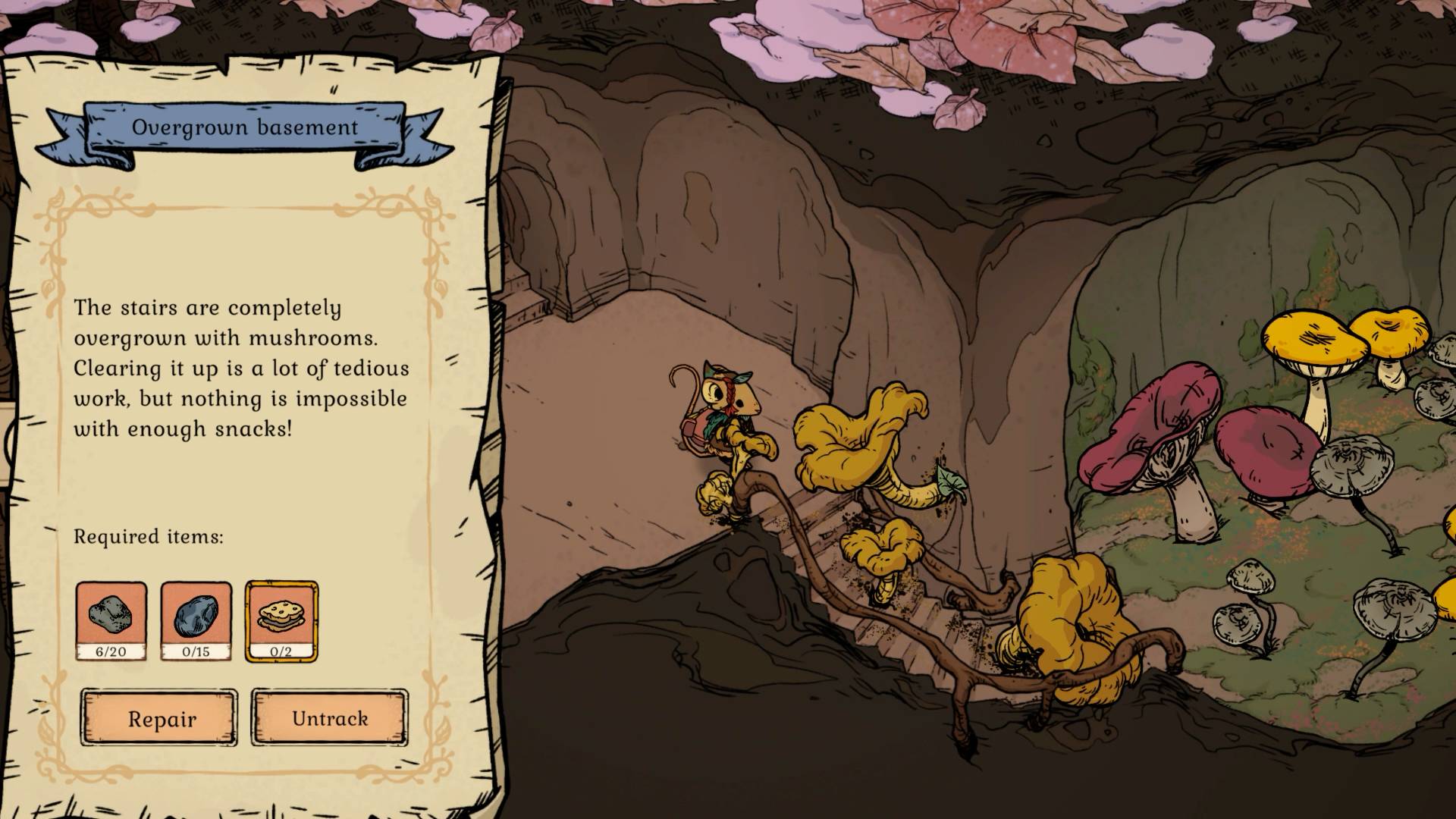 When you settle into your new home, there’s an early mission to find Aunty by fixing and crossing a bridge. She then gives you the key to the basement, where you’ll need 20 pebbles, 15 pieces of granite, and 2 beachnut biscuits to repair the stairs. However, at this stage, the need for granite can be confusing because you might think it’s required immediately, but it actually isn’t. For now, you can plant mushrooms at the top area, which is all you need. The real need for granite will only come later when you’re ready to gather it easily.
