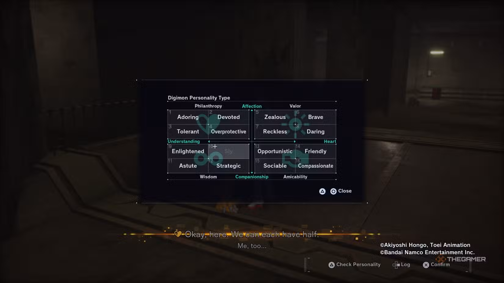 The answers can cause your Digimon’s personality to shift diagonally. For example, if your IceDevimon is currently Sly, a question might make it become Astute—the diagonal from Sly. When this happens, you’ll be given the option to replace its current Personality Skill with a new one associated with the new subtype, like Steadfast Emotion.