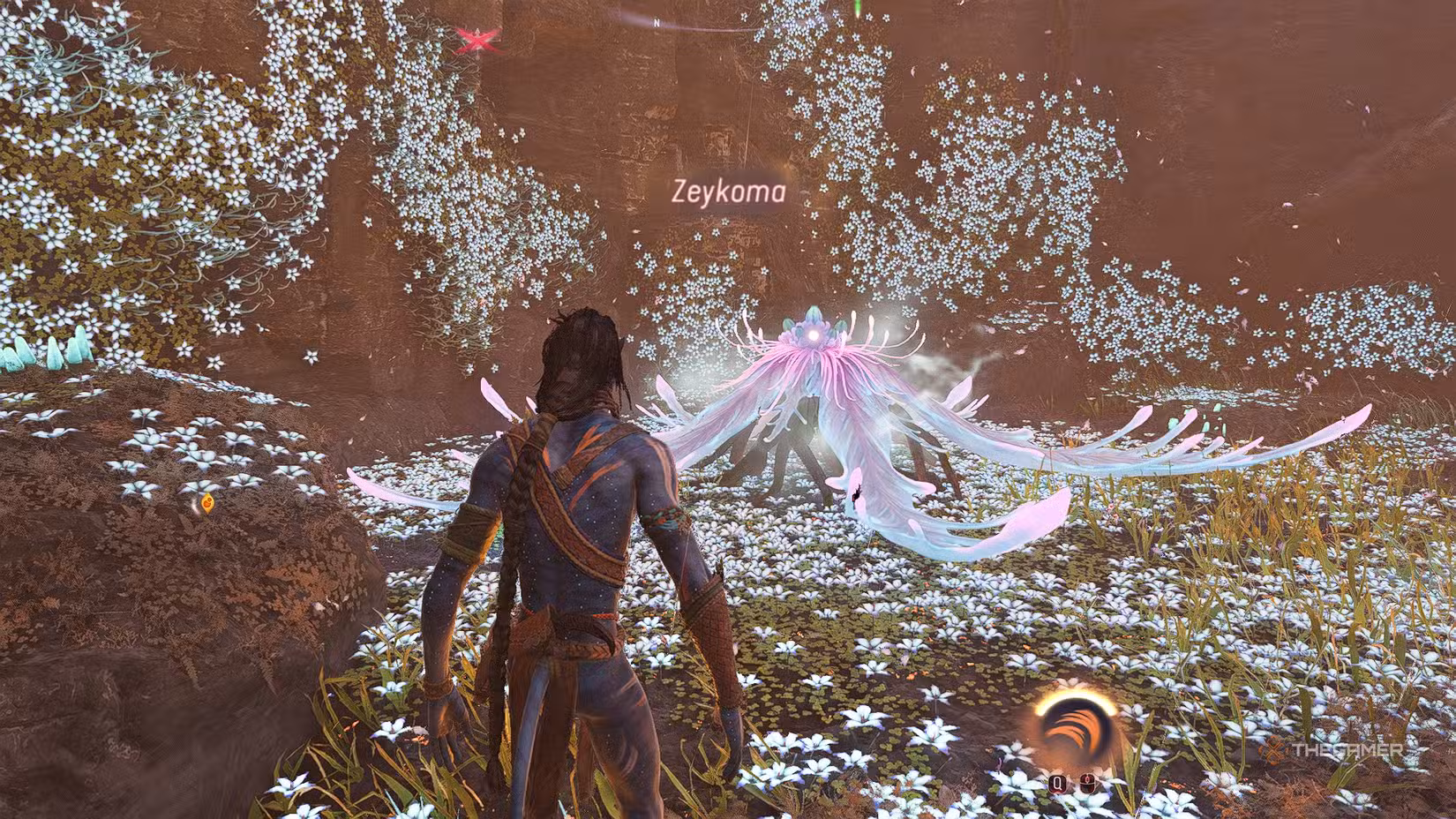 North of Shadow Hollow, east of Dyer’s Bowl, you’ll find a wide clearing full of white flowers. Follow the flowers into a sunken pit, where the Zeykoma fruit glows. After collecting it, Zatslew the Mangkwan Raider will appear. Fight them off, then jump on your ikran to move on to the next spot.