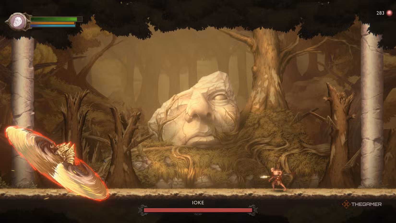 Buzzsaw Spin: Ioke spins rapidly like a buzzsaw across the screen at high speed. This attack can’t be blocked or parried, so you need to roll through it to avoid damage. Watch for the spin to end, then wait before you roll again. Once he rushes toward you, dodge to the side, then prepare for him to turn and do the same move again.