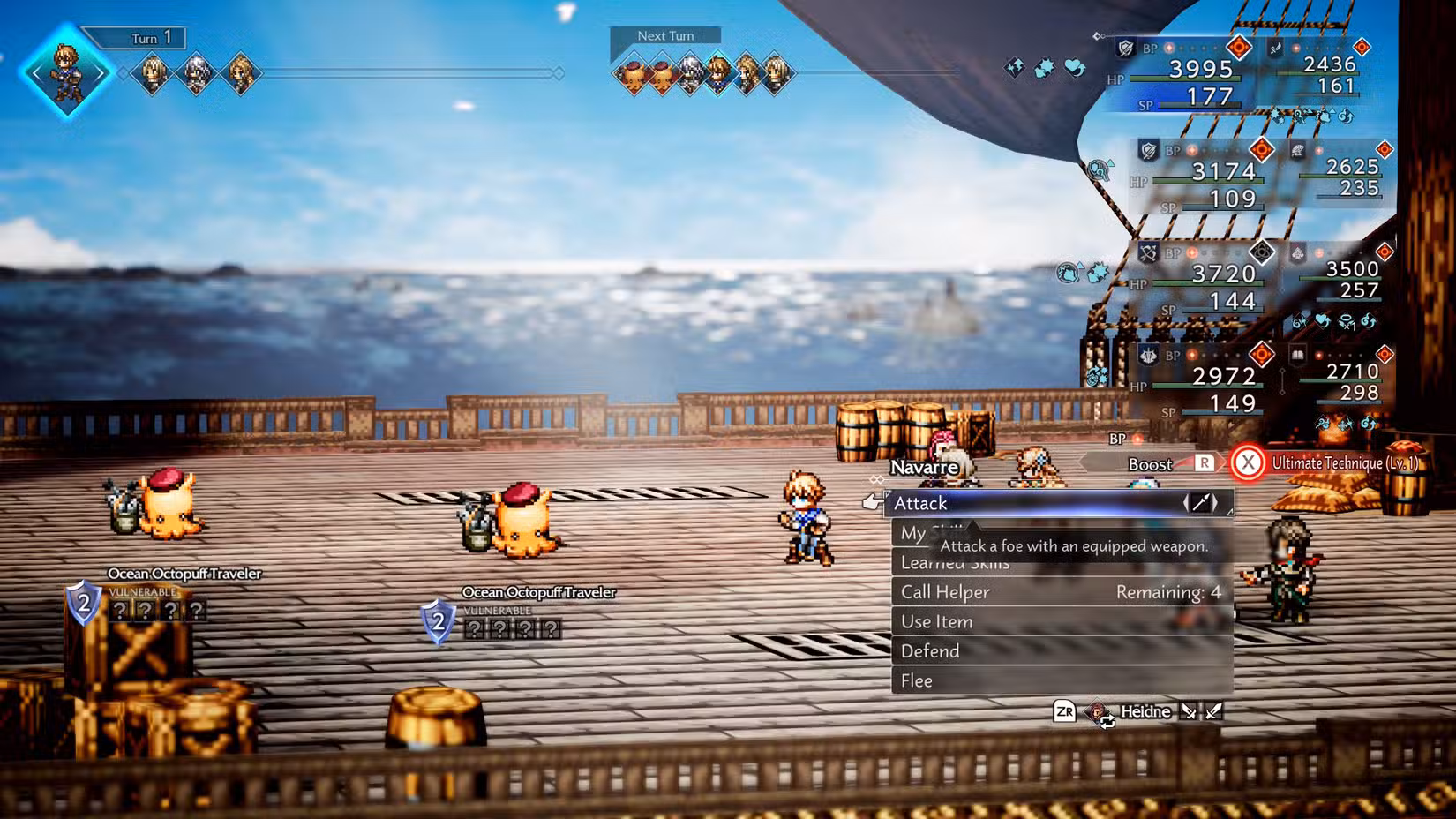 In the final story arc, Bargello joins your team and has a skill that guarantees he acts first in battle. This means he beats even Caits and Octopuffs to the attack. Although a surprise attack often triggers the highest Speed-based action, your first move is assured. Bargello isn’t the strongest character overall but is perfect for quickly gaining EXP.