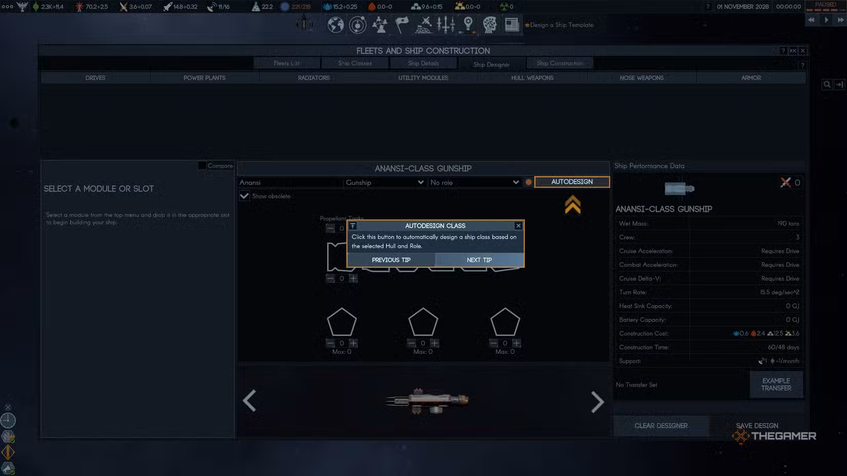 Here’s the exciting part. If you enjoy the detailed aspects of strategy games, you’ll love designing ships. There are no pre-made ships or preset functions. You must design every ship yourself. The game offers an auto-design option based on the hull and role you select, which works fine, but it’s best to build your own ship to understand the mechanics and optimize its performance.