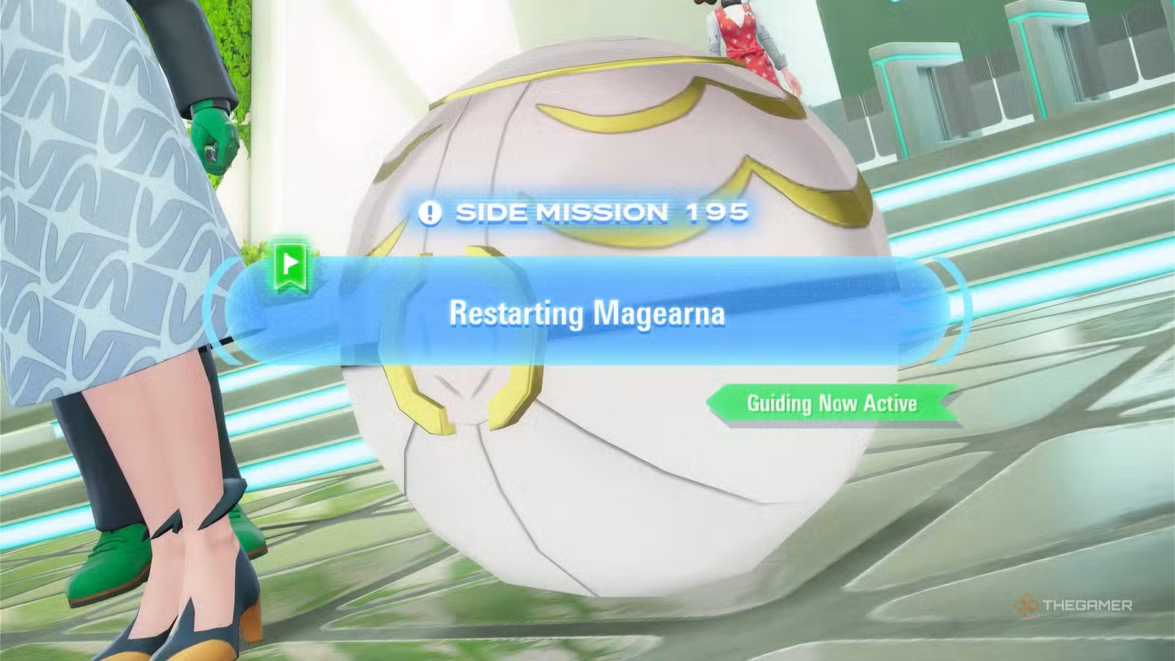 Following this, re-enter Quasartico Inc., and Jett will return as the quest giver for Side Mission 195. To restart Magearna, speak with Jett and gather 999 Mega Shards, which are used to reboot the Pokémon. Once you have all the shards, give them to Jett, and Magearna will awaken from its 500-year slumber, along with its Magearnite Mega Stone to enable Mega Evolution. Returning to Jett with the shards causes Magearna to awaken immediately, and you’ll receive the Mega Stone as part of the rewards.