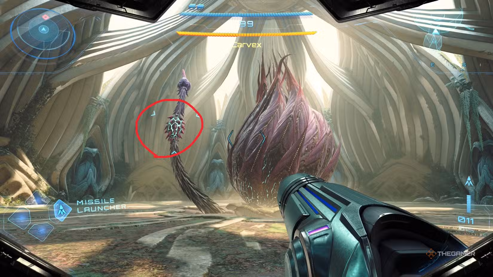 When the battle starts, shoot the bulbous armored tip of the vine near the top with your Missiles. Once the armor is destroyed, target the gooey, weakened section underneath to cut the vine and expose Carvex’s shell.