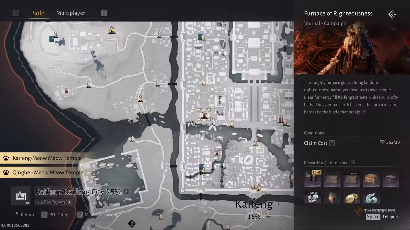 When you arrive in Kaifeng and interact with the map NPC, you’ll find yourself in a large city filled with many houses. There are two different markers for campaign bosses in this city. The first boss you’ll face here is the Dao Lord, located on the bottom right part of the city. Further along in the story, you’ll undertake the Furnace of Righteousness quest, where you break into a giant furnace shown throughout the mission. At the end of this quest, you’ll face off against the God of Avarice. It’s no surprise that he’s the true villain of this region.