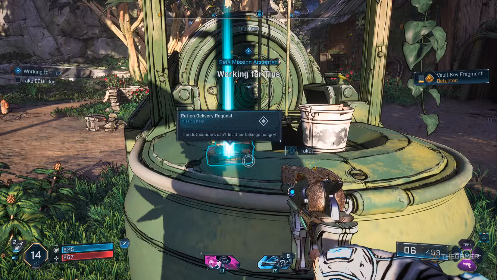 Start the quest by interacting with an Echo log in The Howl. Rush will then call you on the radio, letting you know that some allies have had their food stolen and asking you to bring them more supplies. After accepting the mission, get the delivery bag and head out.