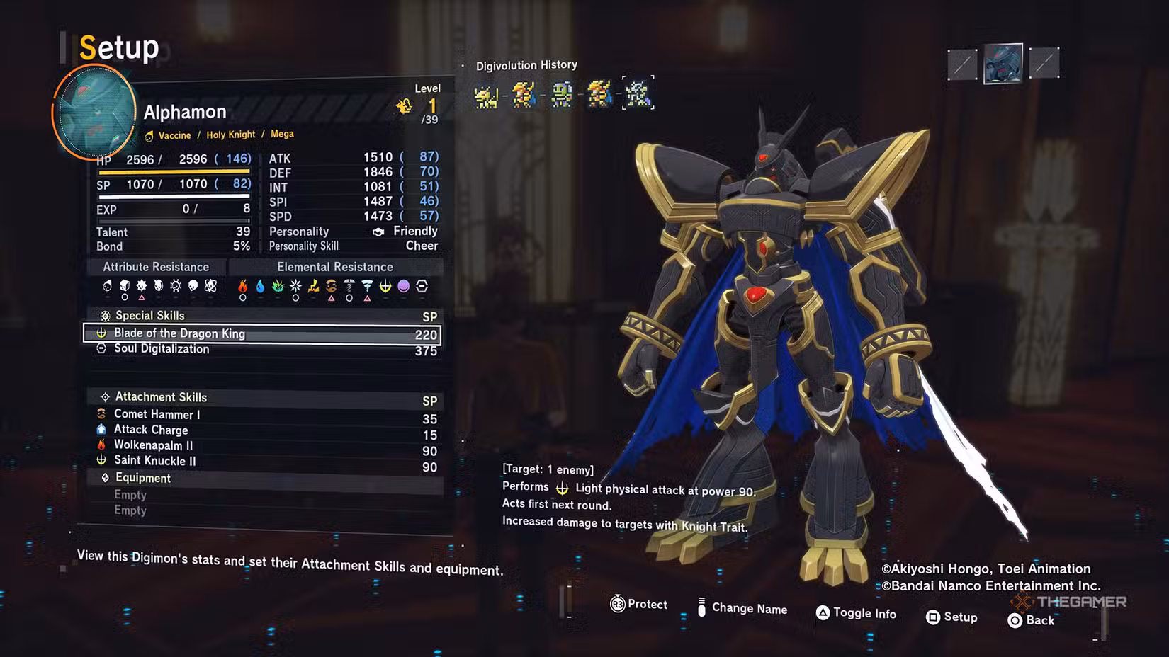 Alphamon is a Mega-level Digimon in Digimon Story: Time Stranger and is one of the 13 Royal Knights. It has appeared frequently across various Digimon media, including TV shows, manga, and video games. The game’s stunning visuals highlight Alphamon’s blue cape and its regal appearance more than ever.