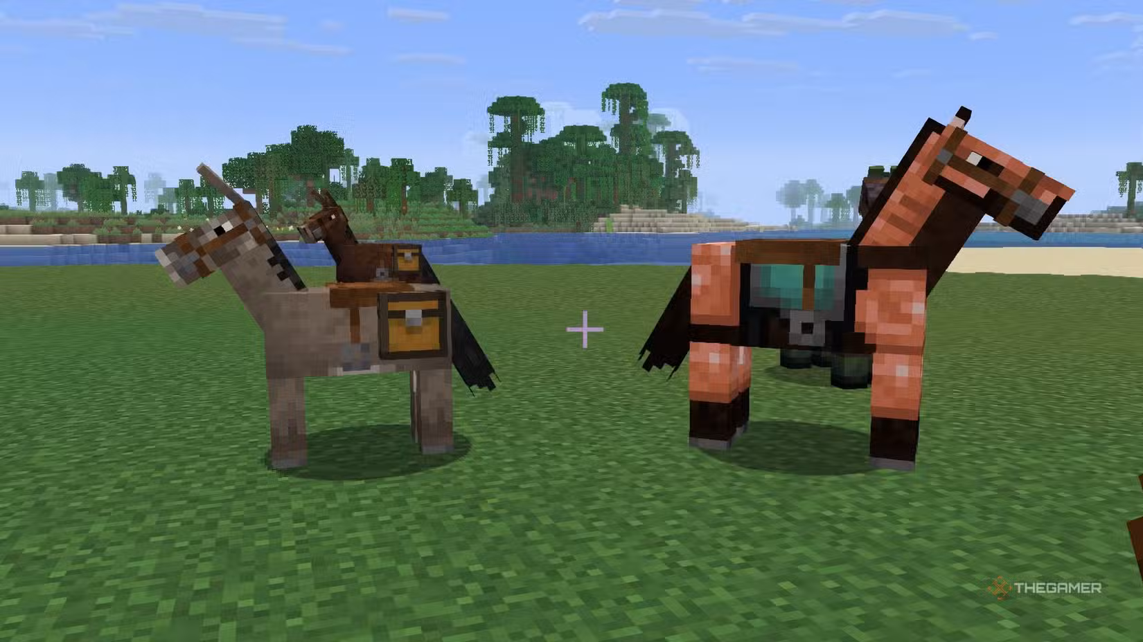 Differences mainly look-wise, as mules combine horse and donkey features, while horses come in many appearances. All these animals require a two-block space to move, can be led or ridden, and are affected by speed potions.