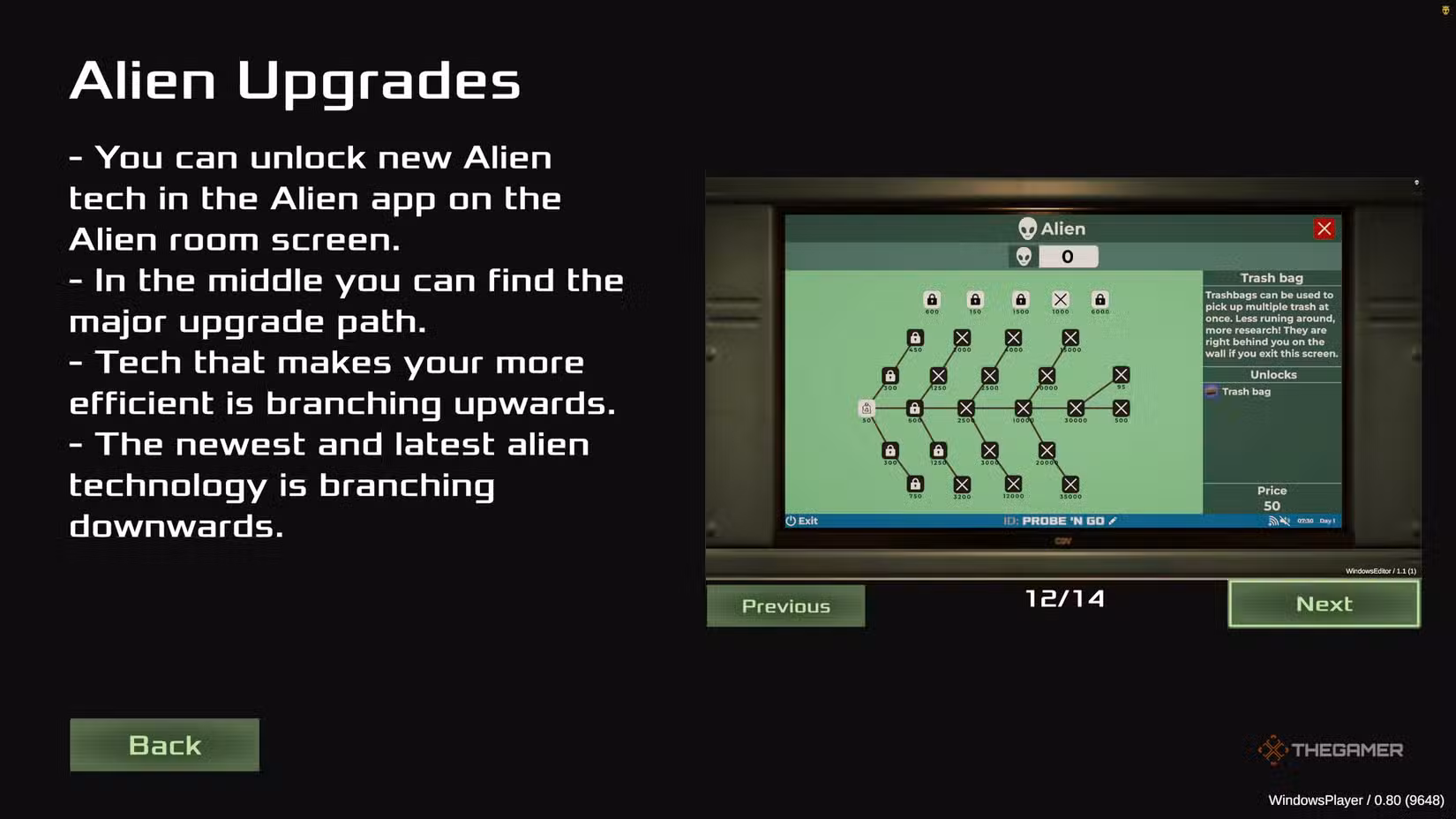 One of the simplest ways to gain research is by collecting trash. Humans throw away trash frequently, with each item roughly worth 20 research points. You need to pick up trash one piece at a time and bring it to the Trash Scanner in the alien room at the back.
