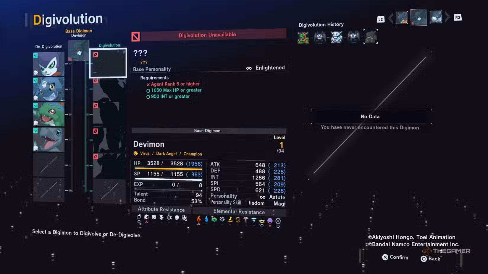 With either Devimon or IceDevimon, you can then evolve into LadyDevimon once you reach Agent Rank 5. This will happen further in the game, but completing side missions can help you earn enough Anomaly Points faster.