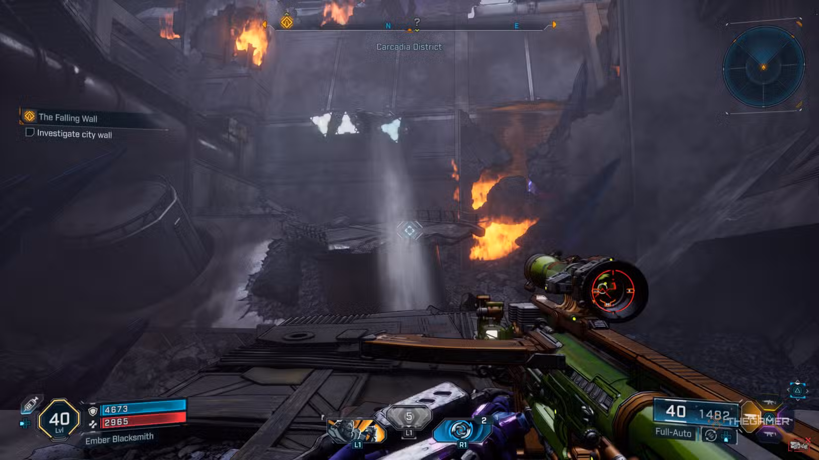 At the end of the path, use a broken pipe spewing air to give yourself a boost. Then, grapple onto the wall to reach a catwalk above. Follow this walkway around until you see a burning piece of wreckage with a grapple point. Jump across, go through the wreckage, and travel underground through the tunnel filled with debris until you reach an active checkpoint below. Once there, go through the door to enter the city, where enemies from the Order faction will attack immediately.
