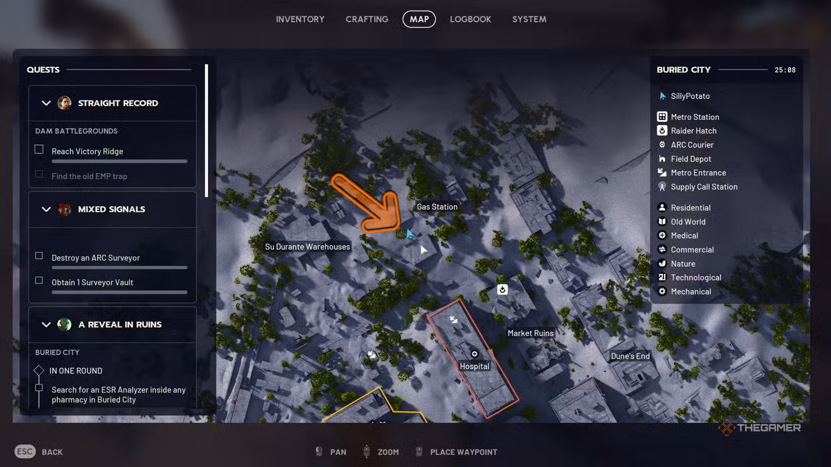 The Gas Station is on the north side of the Buried City, just next to the Su Durante Warehouses. When you arrive, you’ll notice a shed to the left of where “Gas Station” is marked on the map. Leave this shed by heading north-northwest to find the stash.