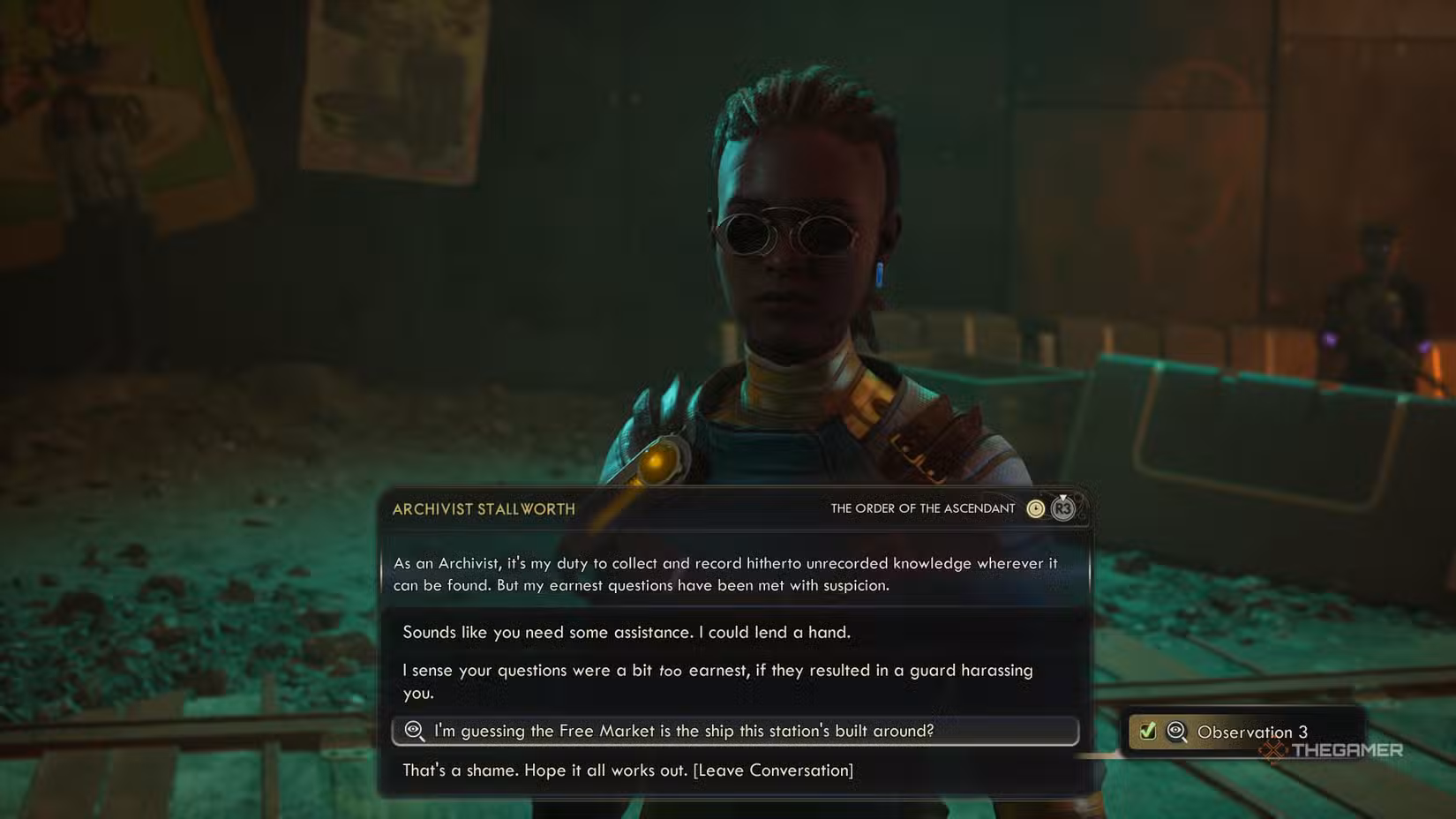 When you arrive at the ACS Free Market, you’ll notice tons of strange advertisements. There, you’ll overhear a conversation between Stallworth, a member of the Order, and Seybold, a Sub Rosa guard. Seybold refuses to share information with Stallworth because she’s associated with the Order, which makes her hesitant to speak openly.