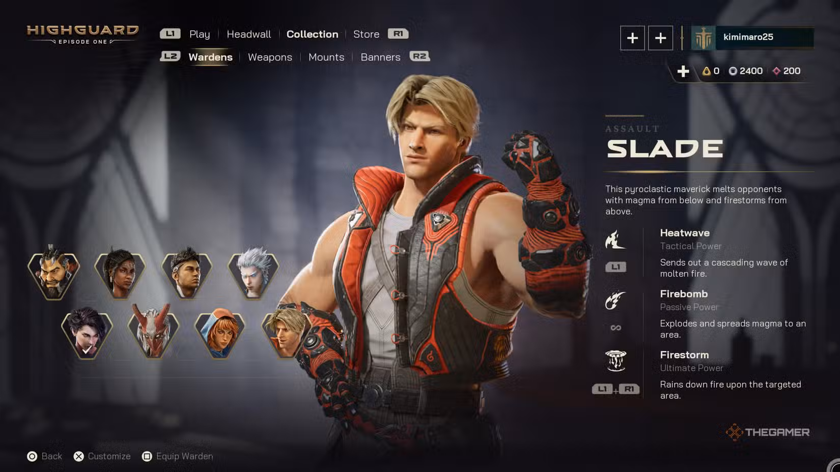 Slade is an Attack Warden, like Atticus. His main focus is on sustained damage and offense. Below are details on his abilities.