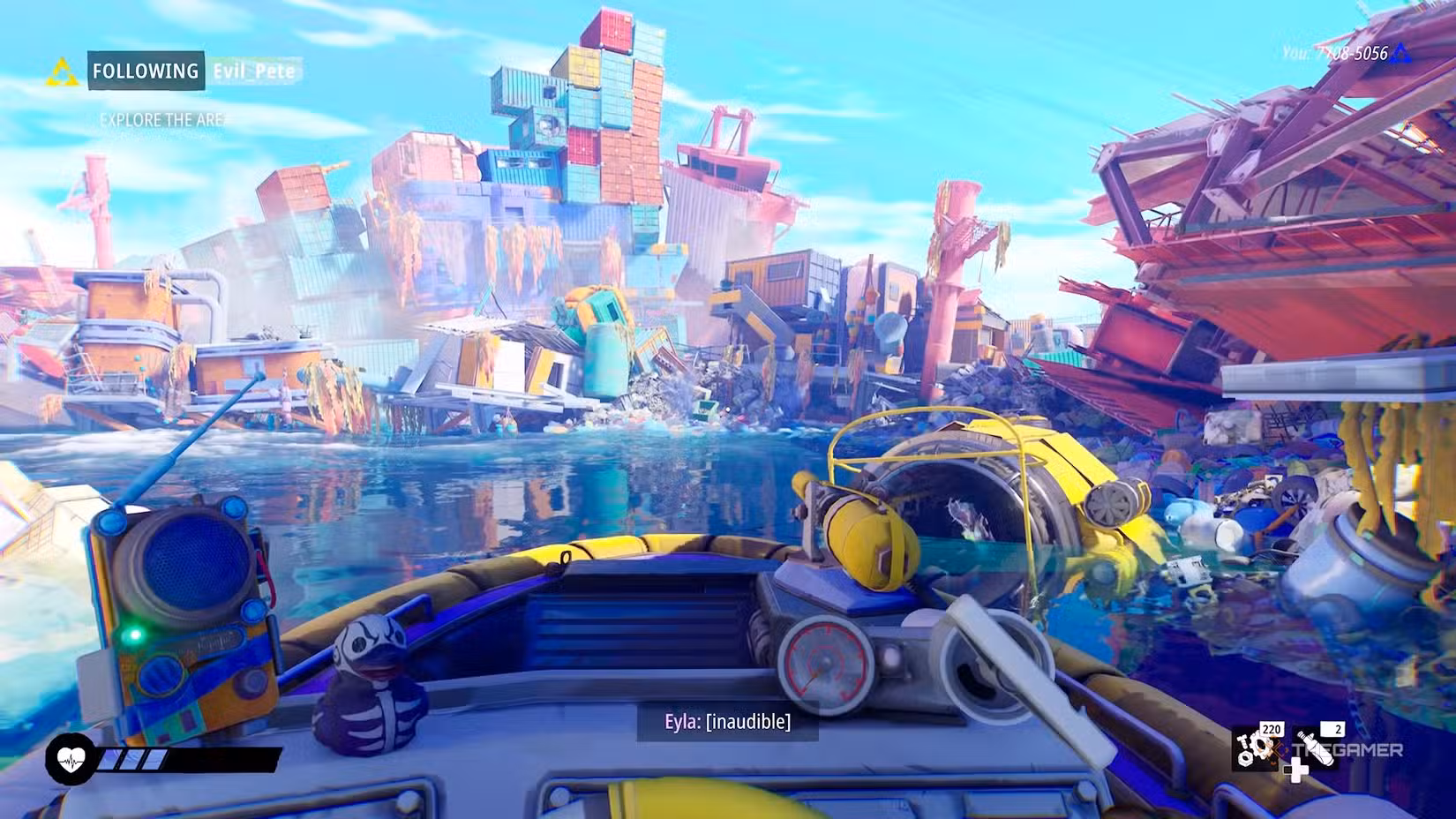 When you arrive, you’ll be stopped by a creature and a yellow submarine. Inside the sub, you can see Eyla banging on the glass and yelling, but you can’t hear her. Eventually, she recognizes you and invites you to board her sub. To start a proper conversation, drive your boat close enough to Eyla so you can understand her words.