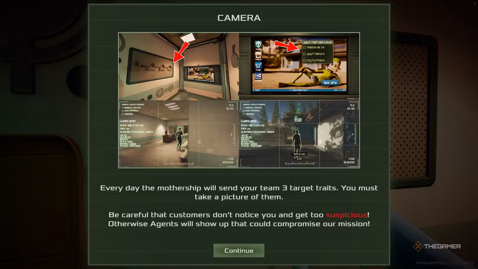 Since you’re an alien, taking random pictures can raise suspicion. If a customer notices you taking a picture, your suspicion level rises, though this will decrease over time. Too many reckless photos can result in a store full of hostile agents.