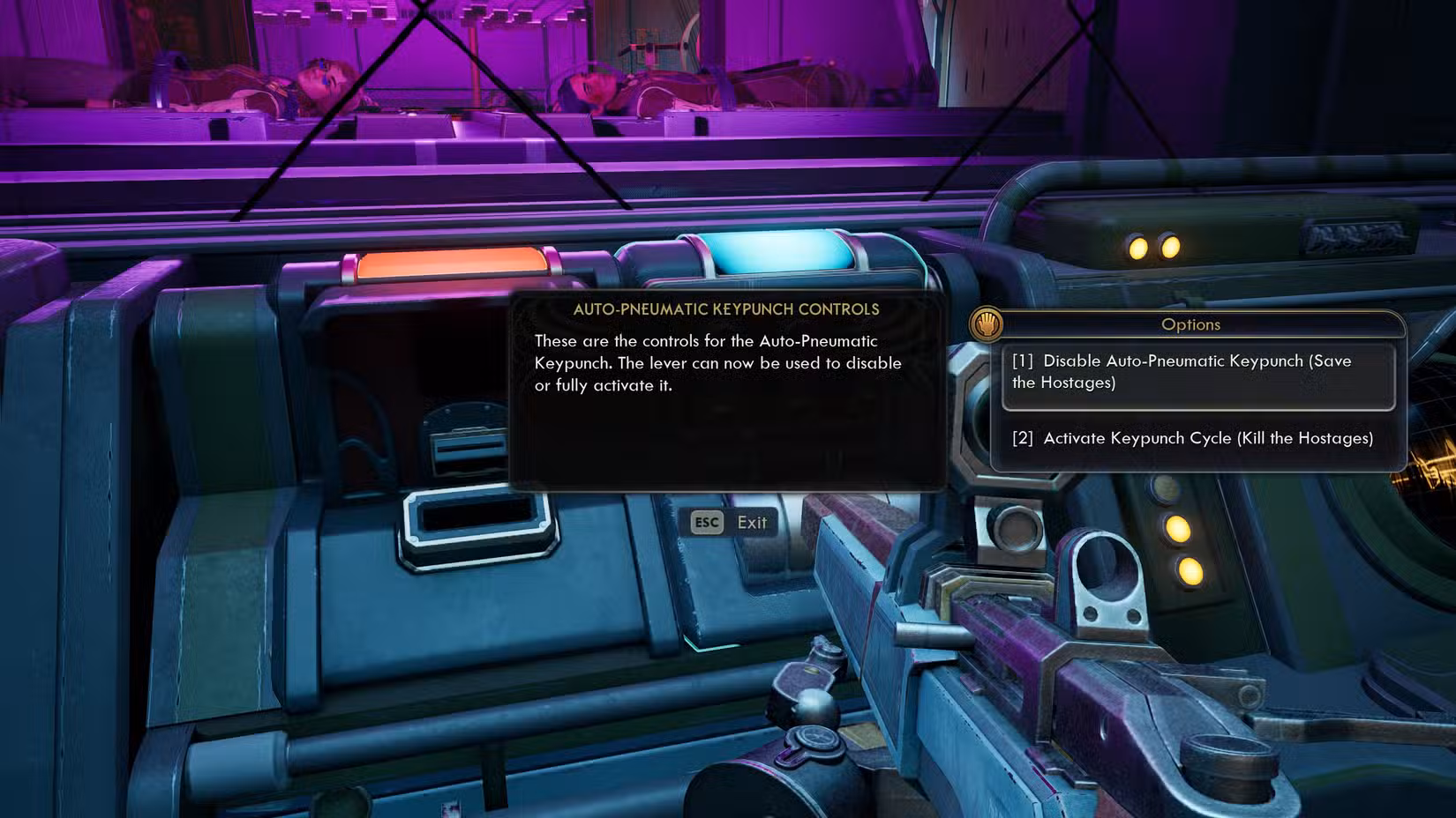 Afterward, you get a special key card. Use it at the machine with the hostages, and decide whether to save or kill them. Saving them rewards you with a +3 reputation with the Order and other benefits. Killing them might seem appealing for certain playstyles, but it usually offers fewer long-term advantages.
