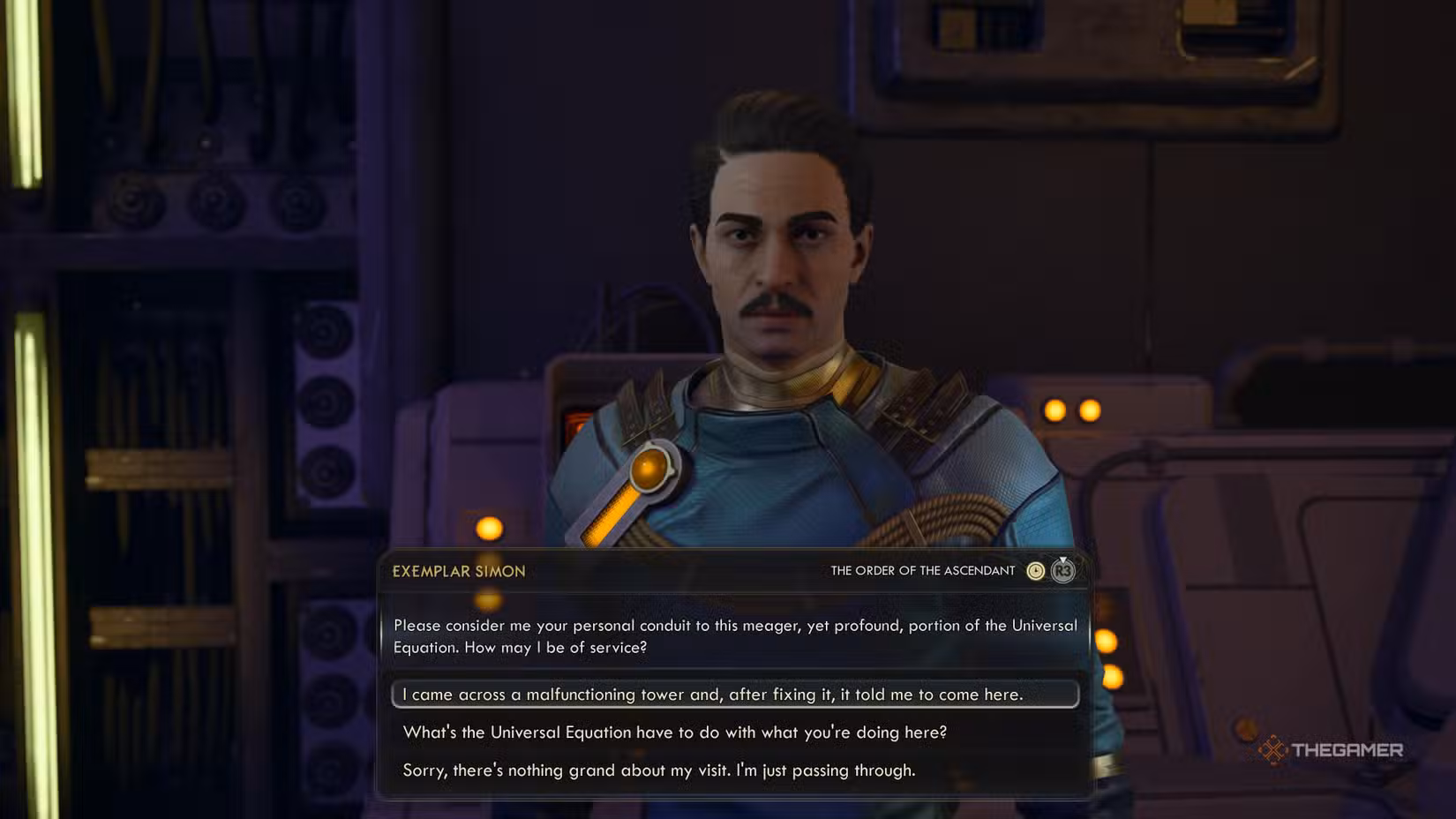 The Grounding Tower is easy to find. It’s just south of the landing area where you start in Praetor. Take the lift down, then go directly south—the journey should be free of enemies. When talking to the Order Exponent at the gate who asks how you arrived, you can say it was a quick walk. He will let you inside and suggest you meet with Exemplar Simon. Simon is at the top of the tower, which is stuck due to the lightning storms. The Order Exponent says you can also climb around the hillside to reach it, making this a simple task compared to climbing the tower in the “A Final Death For Gravity” quest on Paradise Island.