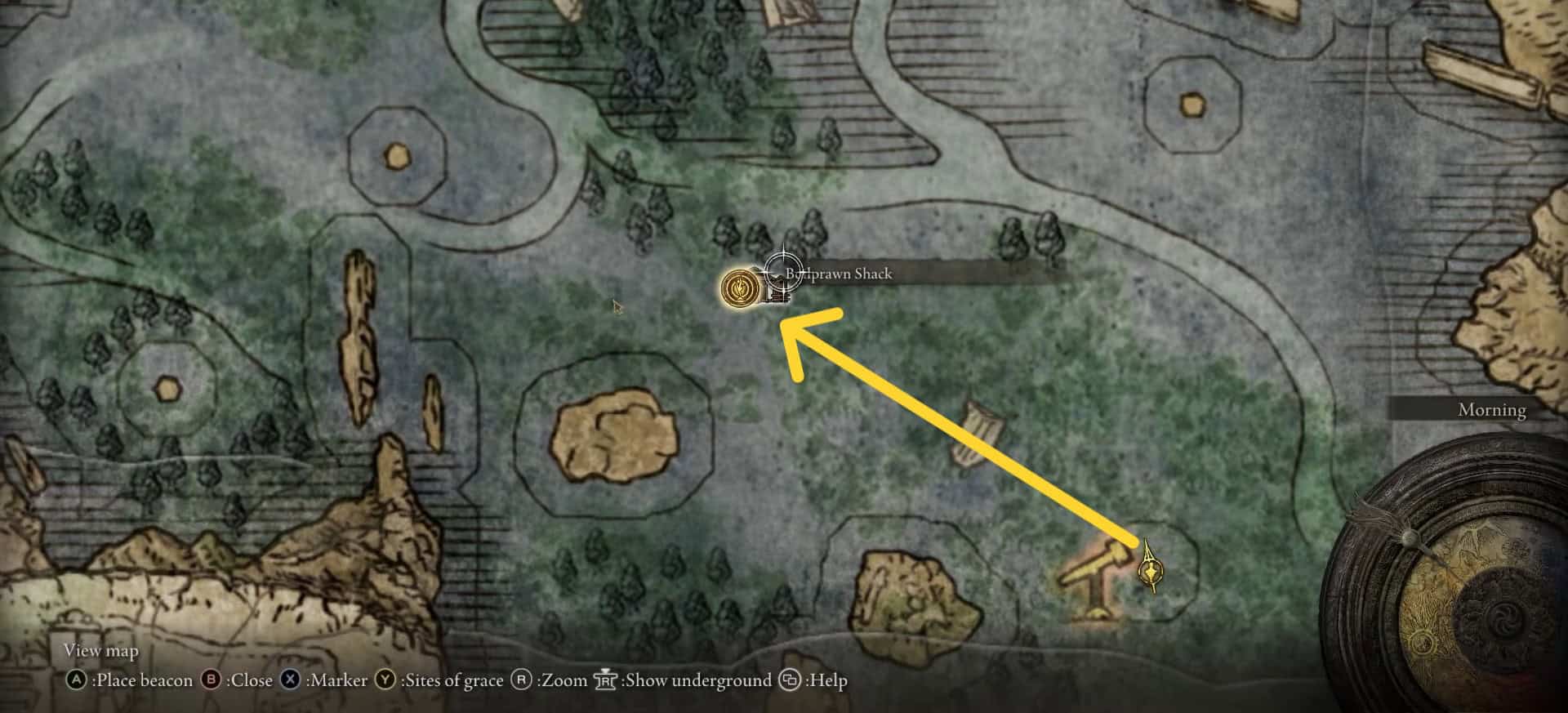 Once you’ve built rapport with Boggart, he will relocate near the entrance to Leyndell. To find him, start from the Outer Wall Battleground site of grace and head east toward the moat. Instead of heading directly to the entrance, go down the hill to spot Boggart sitting by the moat. Speak to him to buy an unlimited supply of Boiled Crabs, each costing 600 Runes.