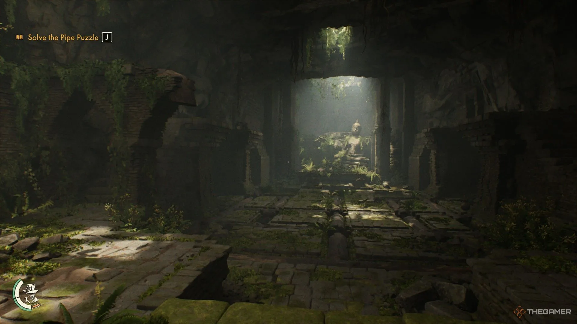 Snap a photo of the Naga Statue ahead to your left, then go straight through the collapsed wall ahead; there’s a climbable wall just beyond it to your left. Turn right once you reach the top and move along the corridor until you see a large, inactive waterwheel. Use this as a platform to run across, but be quick, as Indy’s weight will cause it to turn, potentially dropping you into the pit below.