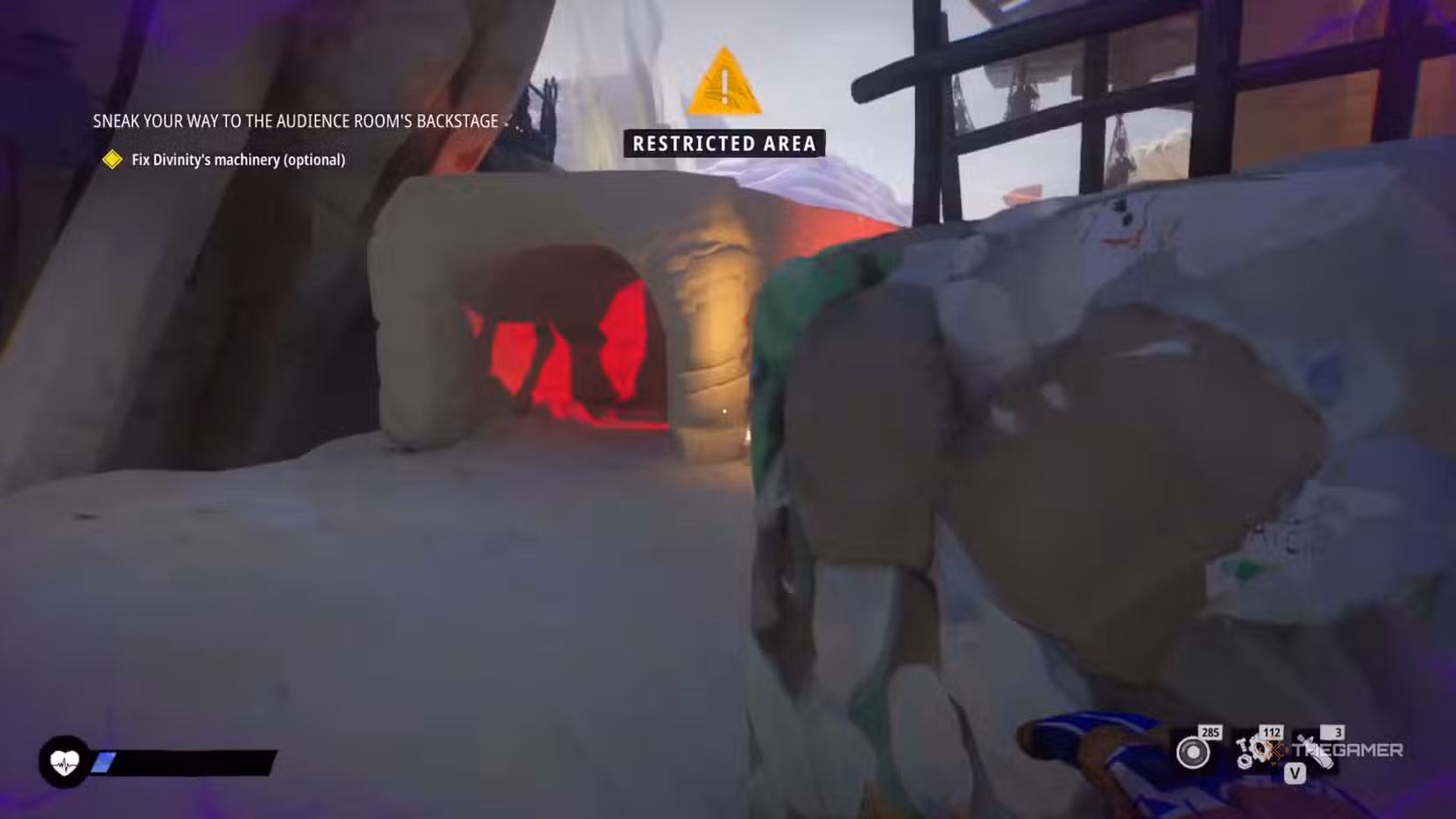 In the restricted area, use the small caves to sneak past when the Mystics aren’t looking. Collect the two scrap piles along the way. Before jumping down to the next section, use your vision to locate where the previous Tidewalker hid.