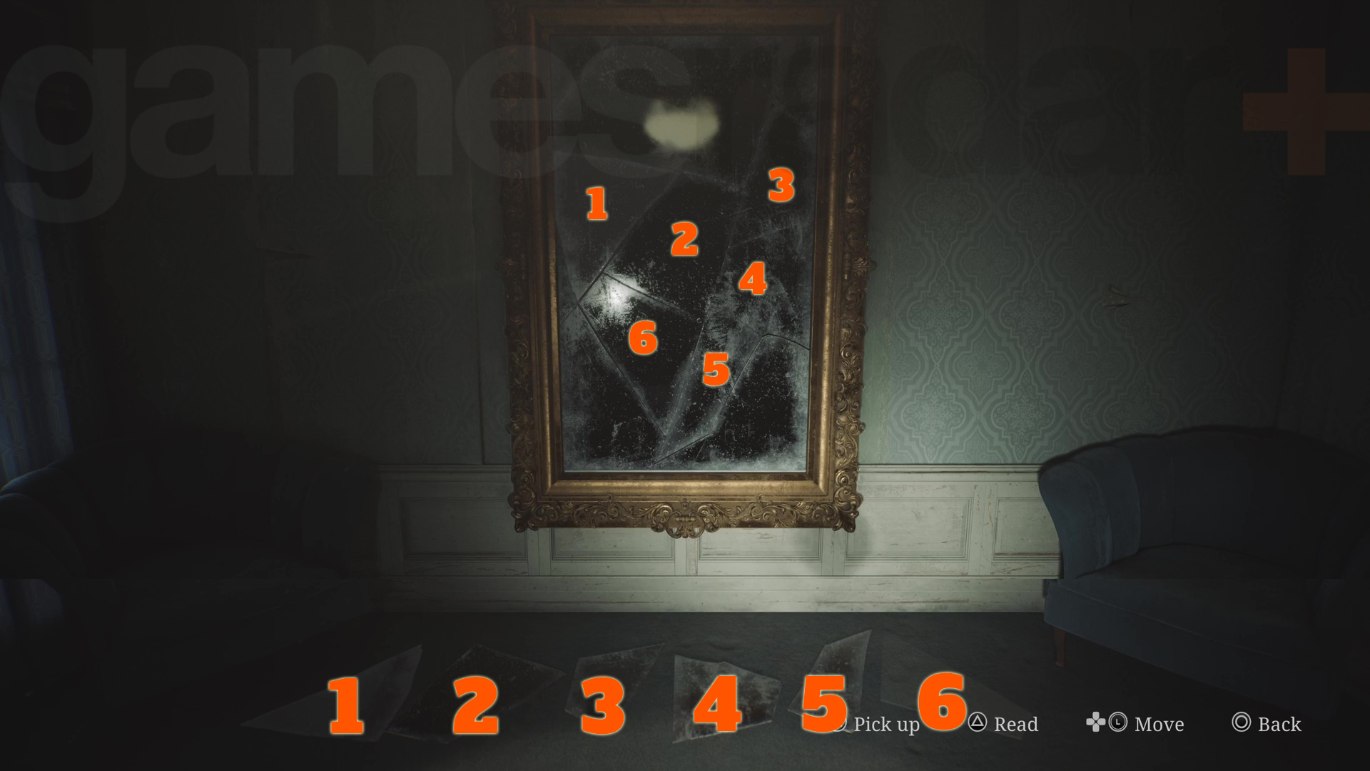 Fixing the broken mirror is simple. The mirror pieces need to be put back together like a jigsaw puzzle. First, grab the piece behind you in the bedroom. After that, just figure out where the remaining pieces fit. I’ve included a clear image showing the correct placement, with numbers indicating where each piece goes. Once the mirror is reassembled, you’ll see an option to place something on the dish in front of it.