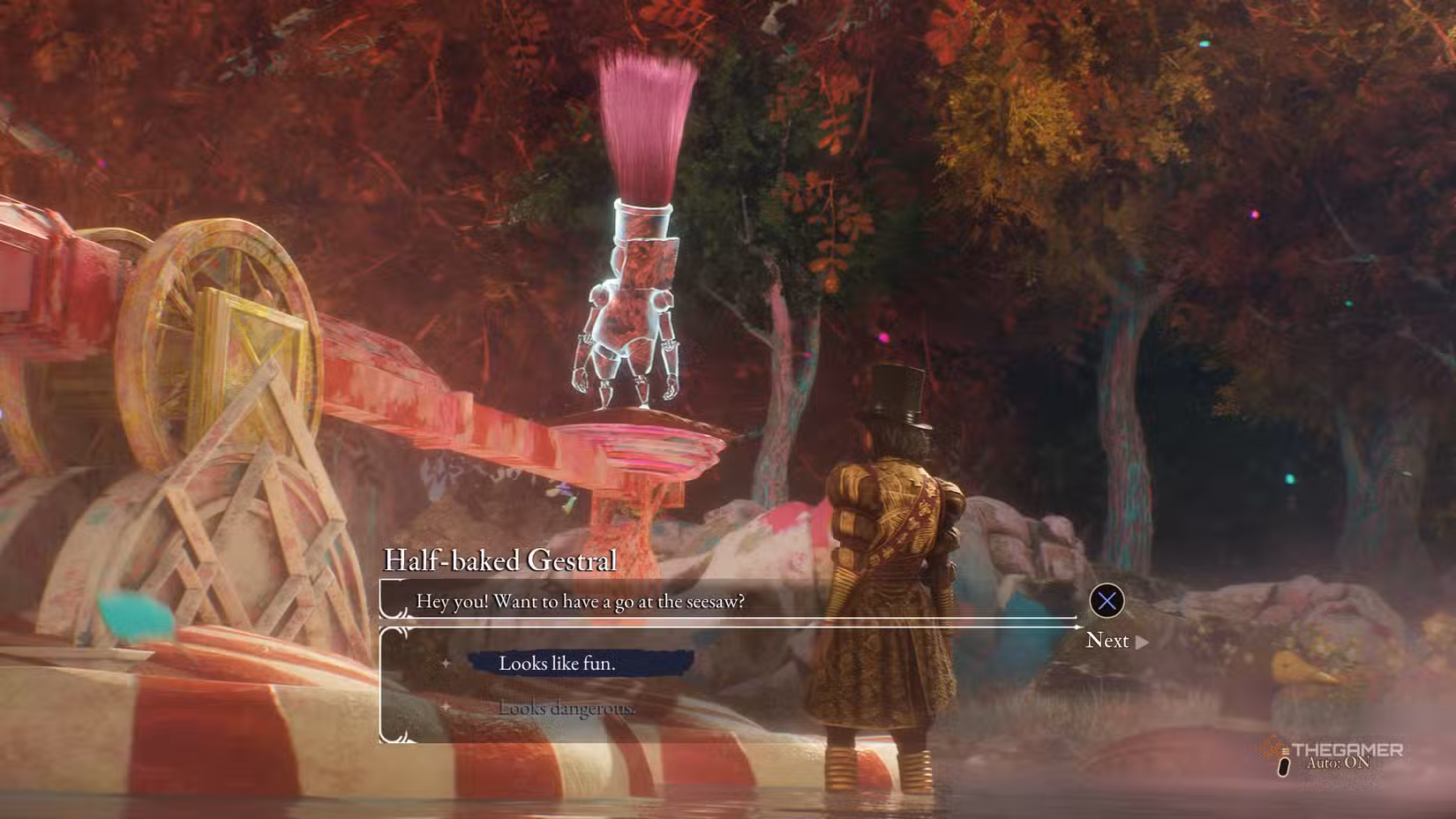 After agreeing to play with this little Gestral, you’ll enter a combat event. Unlike most of these mini-games, there’s no need to parry here—because a seesaw simply won’t move like that. As the match starts, the Gestral jumps into the air, and a symbol appears telling you to jump to dodge its attack. Usually, the jumps are generous enough to avoid hits, but you need to be precise. Instead of jumping exactly when the symbol appears, try jumping just before the Gestral lands. This way, you’ll land on the seesaw just as it’s rising, pushing it down and sending the Gestral flying back into the air. You’ll need to do this about three or four times to win.