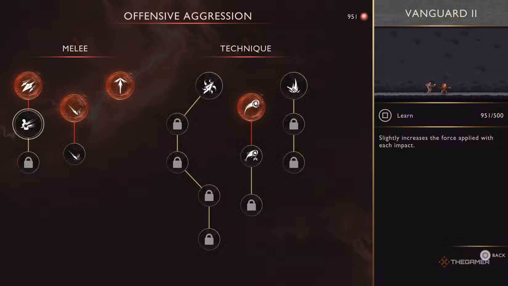 | Vanguard II | Offensive | 500 | Slightly increases the damage of each impact. | This skill, especially when combined with Vanguard III, offers a balance of attack power and defense. When you deal damage, your opponent moves slightly away, giving you space to dodge or land another hit. Note: It’s less useful against bosses. |