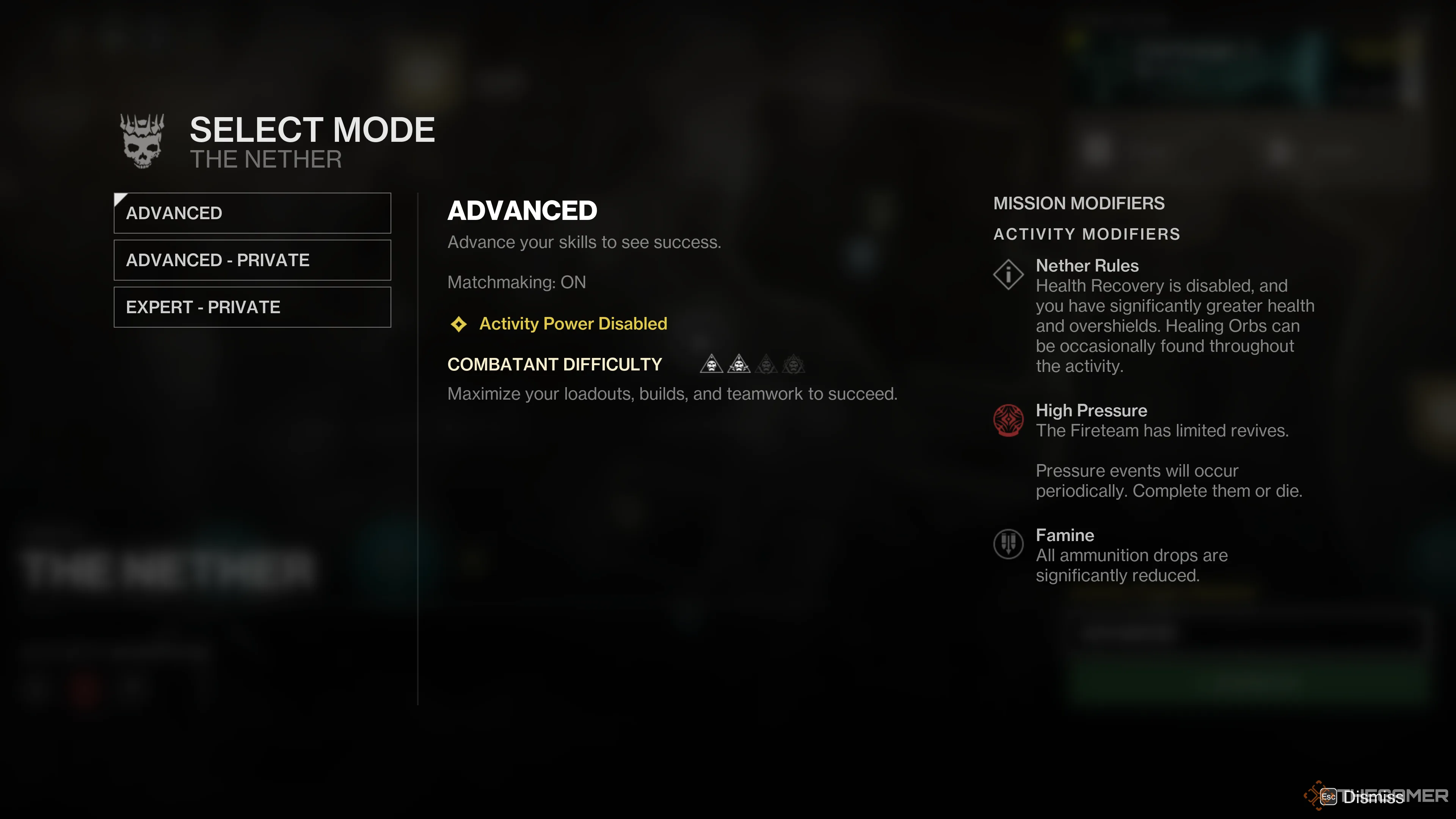 The Nether offers two difficulty levels: Advanced and Expert. Advanced is designed for standard play and includes matchmaking options. In contrast, Expert provides a more challenging experience with features like Champions and no matchmaking.
