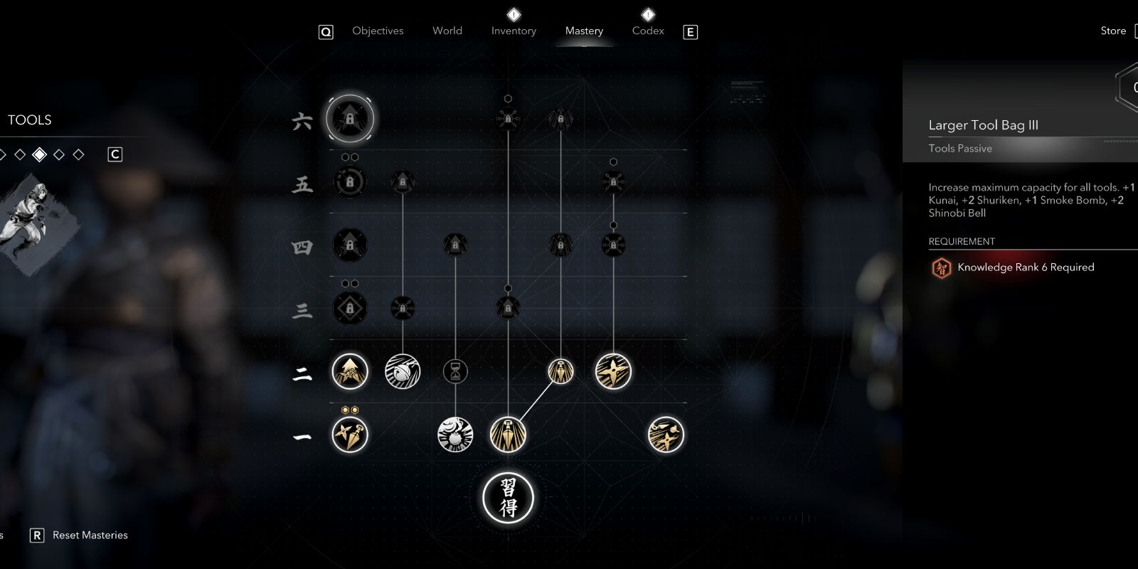 Since smoke bombs and shinobi bells are not as effective in Shadows, consider investing mastery points in them only if you genuinely wish to use them.