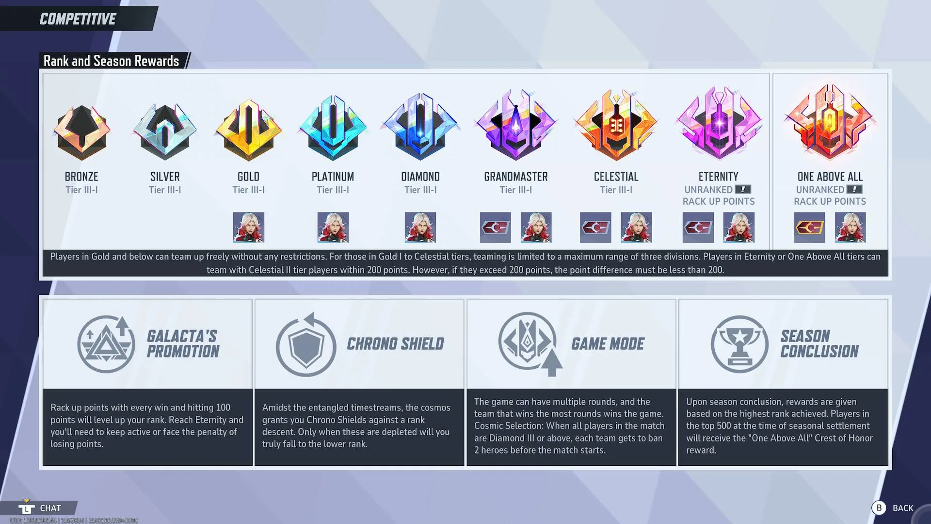 - Players ranked Eternity and One Above All can join with Celestial II and I players if the difference in their total rank points is under 200.