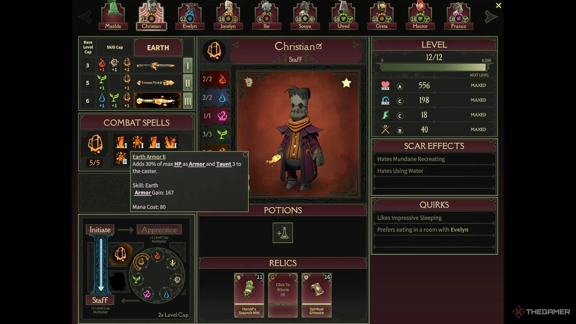 Each character has ratings in four key stats: Health, Mana, Speed, and Power. These stats determine their growth potential, allowing them to gain points when leveling up. The maximum level is influenced by their wand level, multiplied by their apprenticeship and staff position, resulting in a range from three to eighteen.